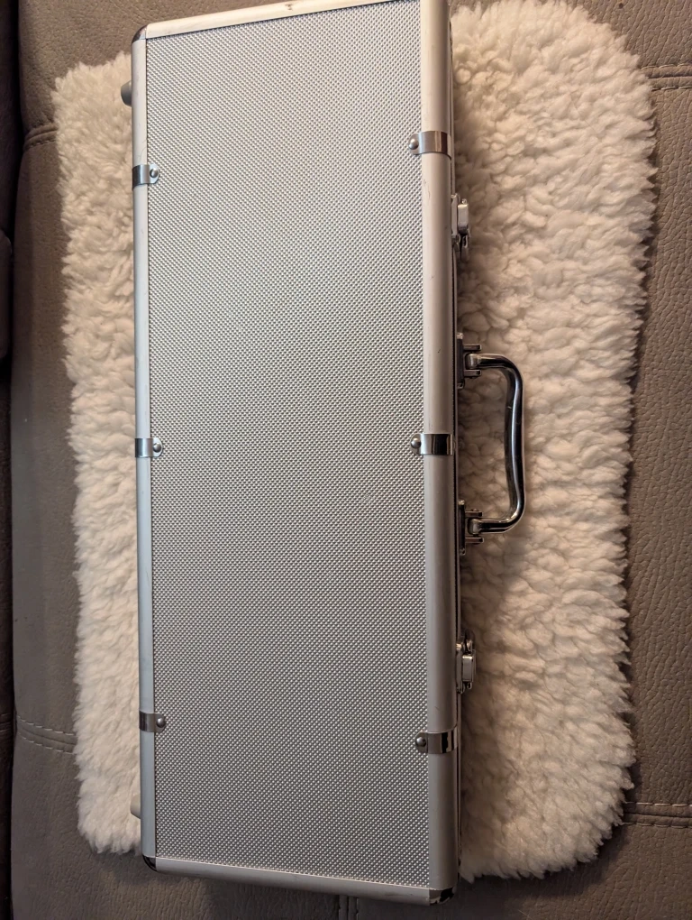 10Selling a poker chip set, complete with chips, cards, and dice, all neatly organized in a case. Also included is a roulette game set in a carrying bag! The poker set weighs nearly 20 pounds, as they are professional clay chips, just like a Casino. Red deck of cards still sealed.