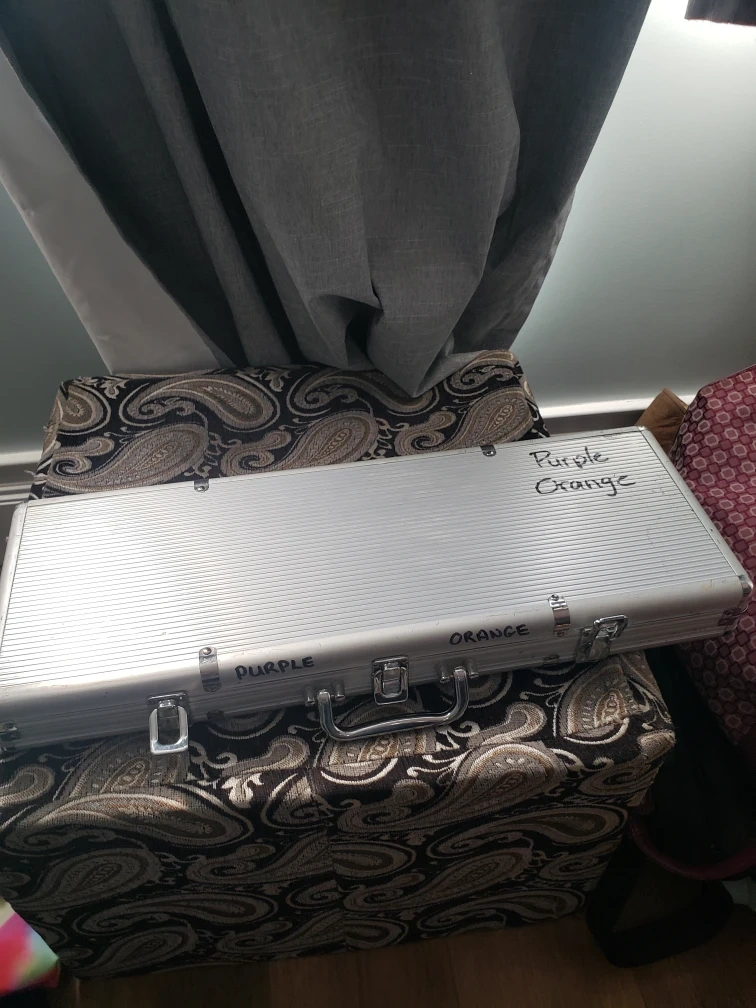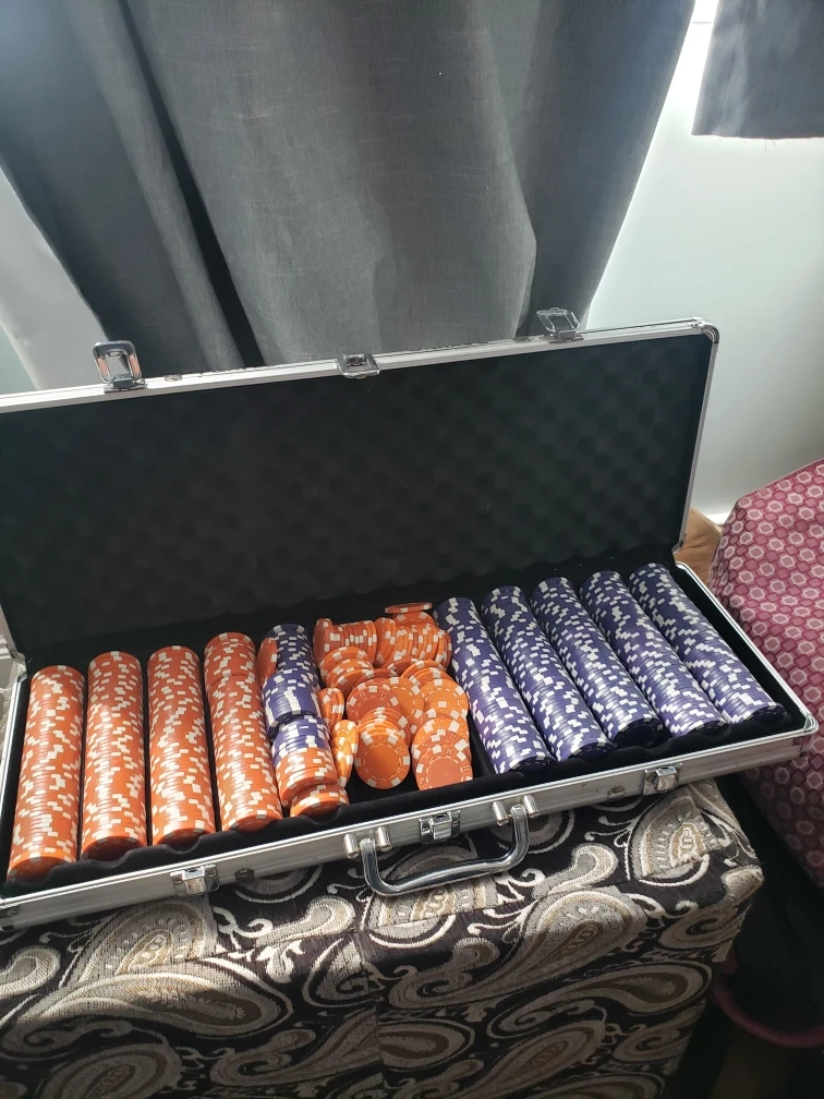 Selling a poker chip set with purple and orange chips. It comes in a silver carrying case. Great for game nights with friends and family!
