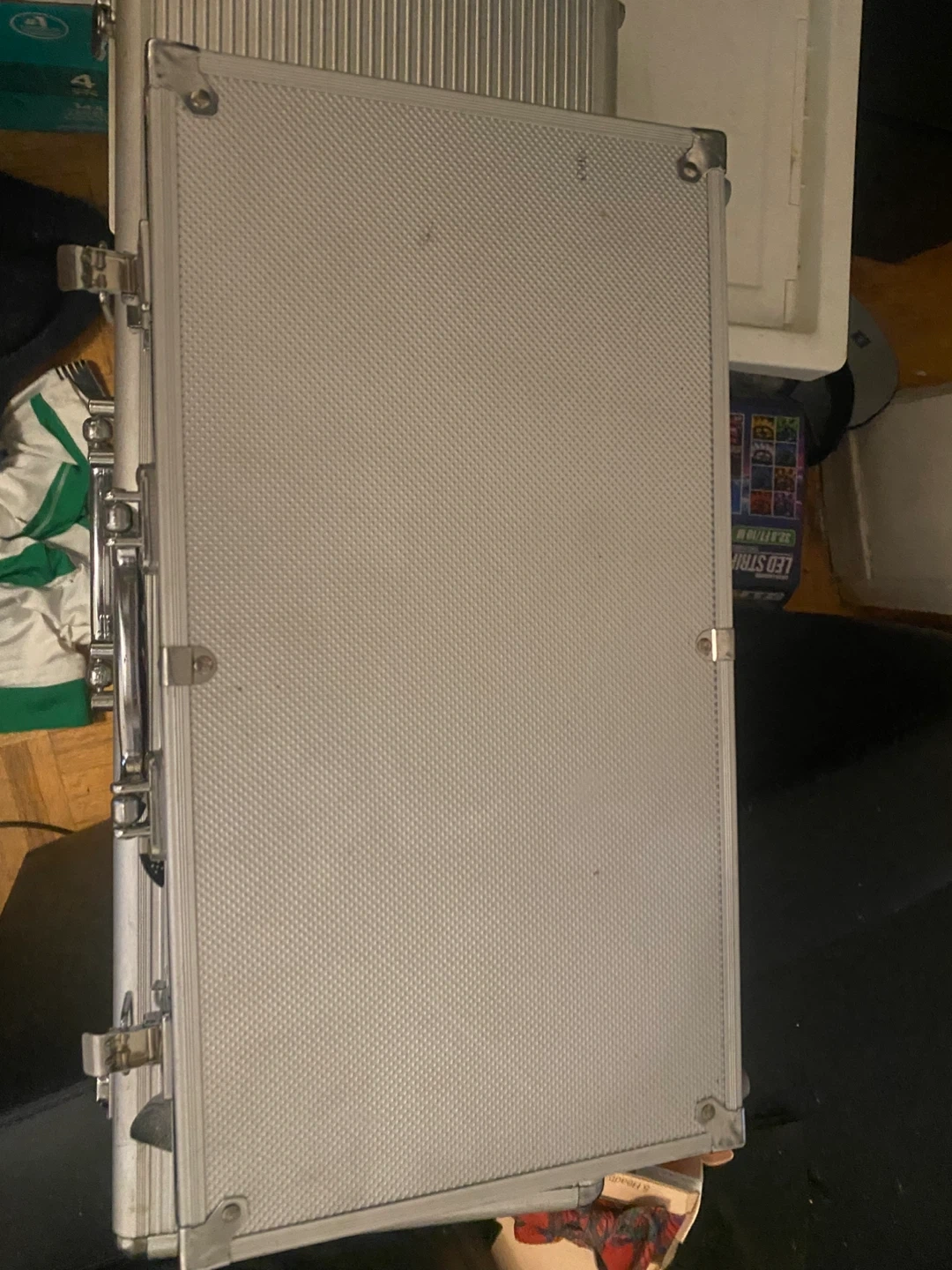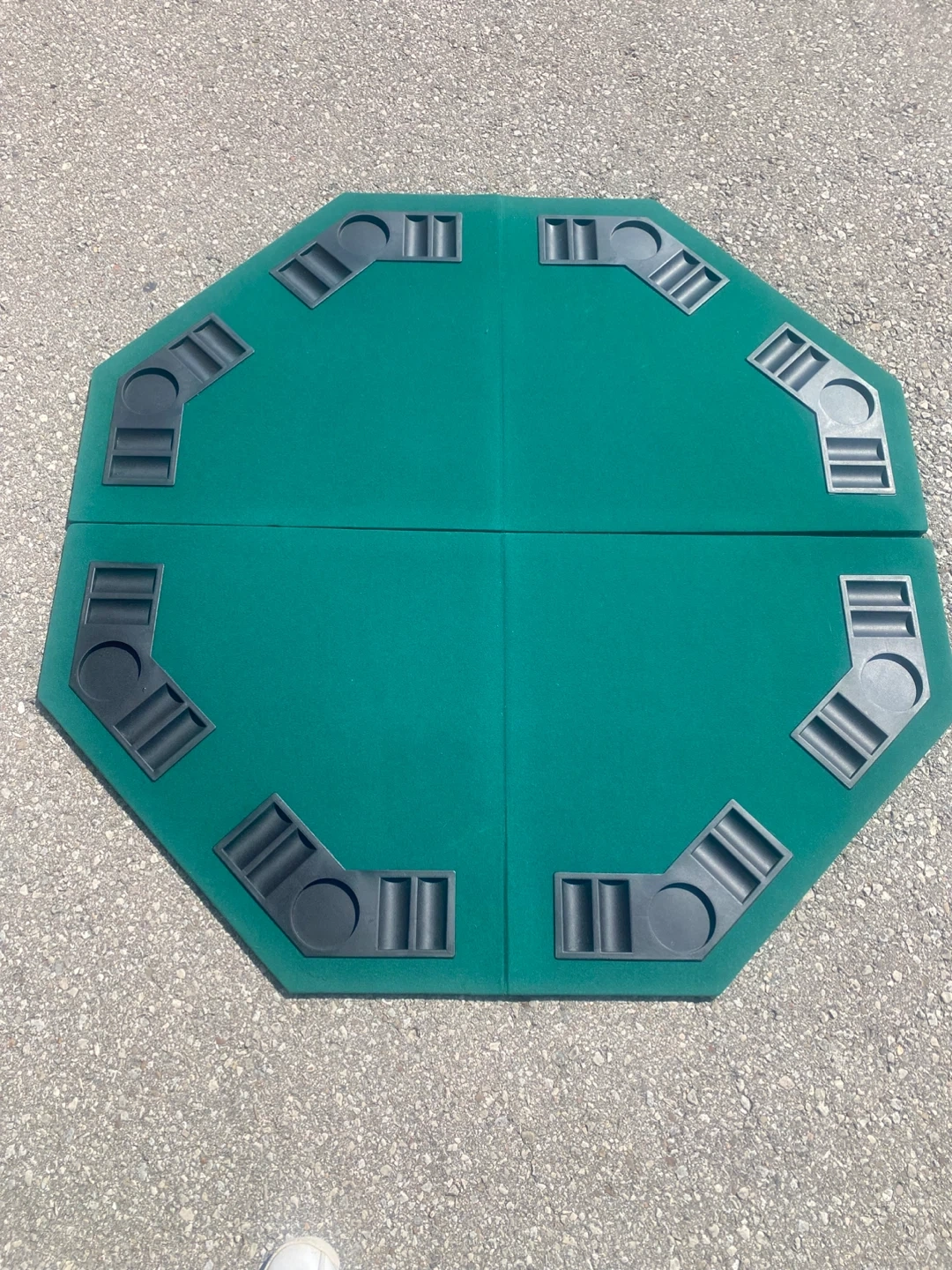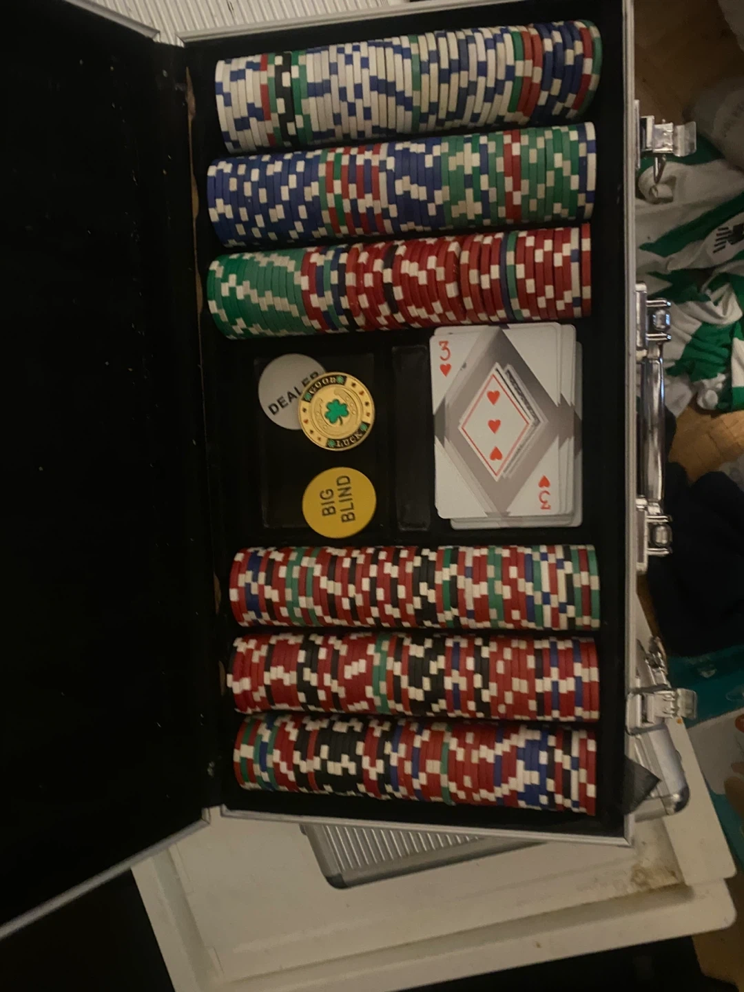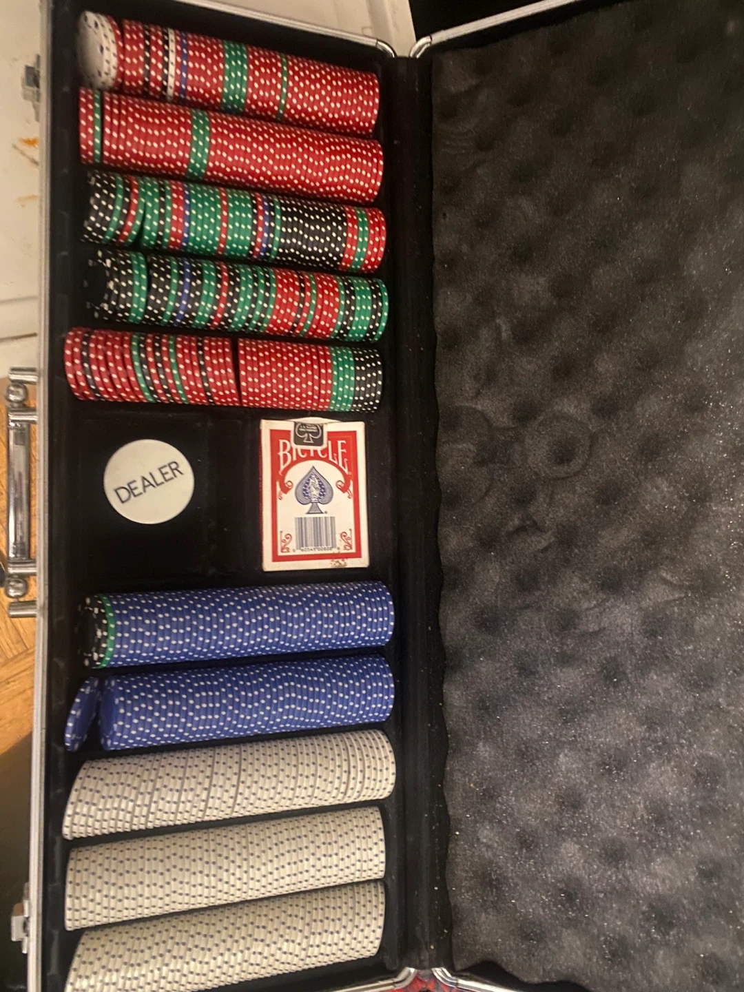 Selling a complete poker set, perfect for game nights! It comes with a sturdy carrying case to keep everything organized. Also included is a green felt poker table top, so you can set up a game anywhere. Get ready to shuffle up and deal!