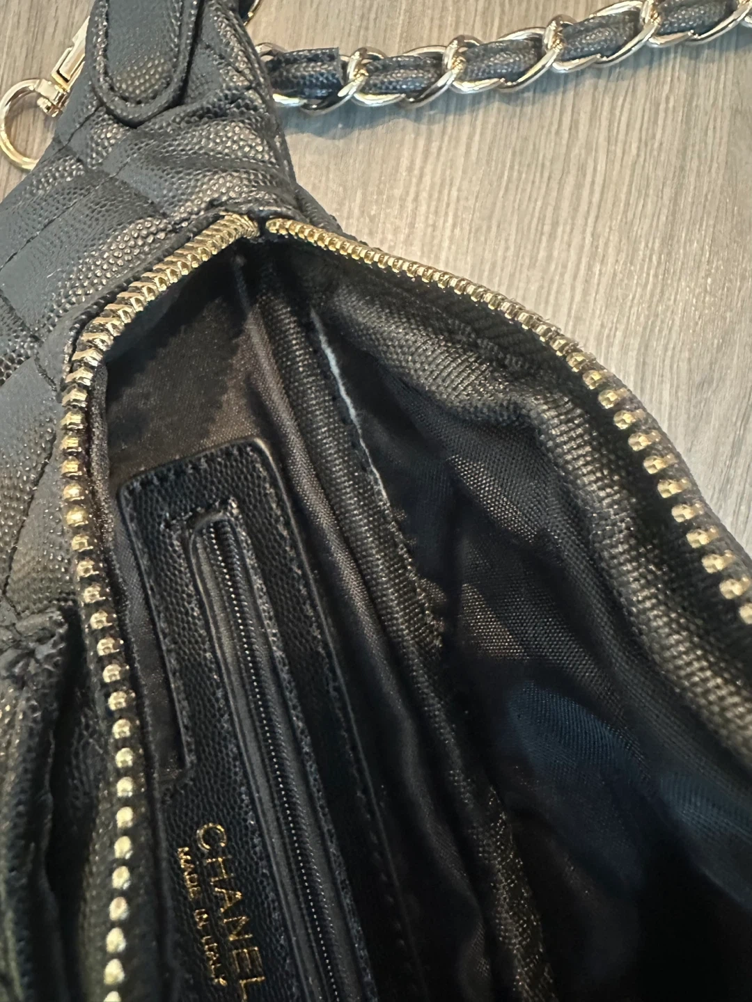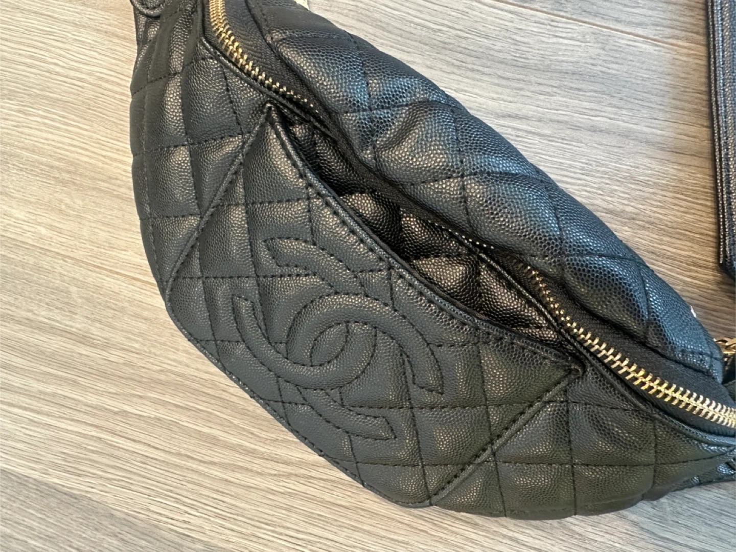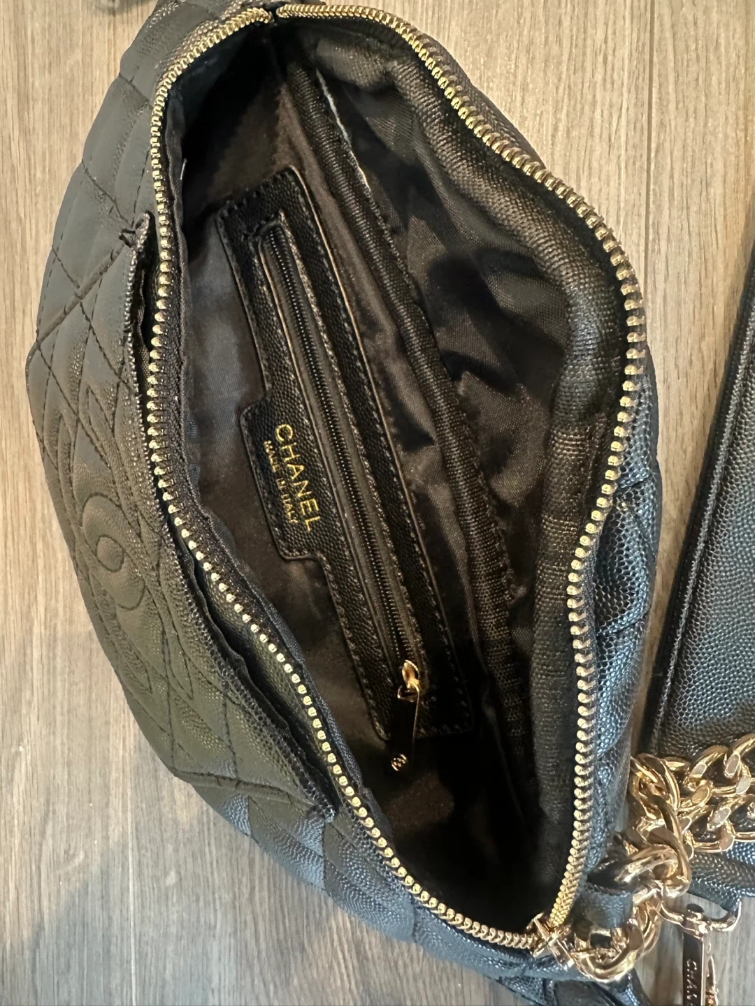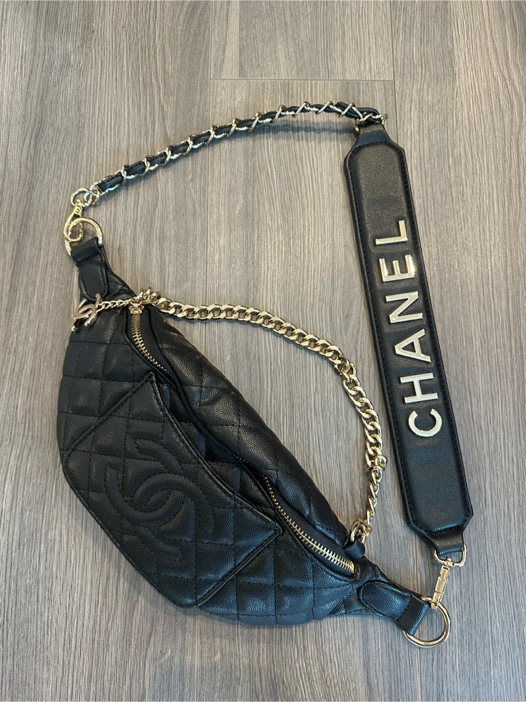 Black quilted faux leather belt bag with a "CHANEL" embossed strap and gold chain detailing. It's got zippered closures and an interior pocket. This bag's great for travel or everyday use!