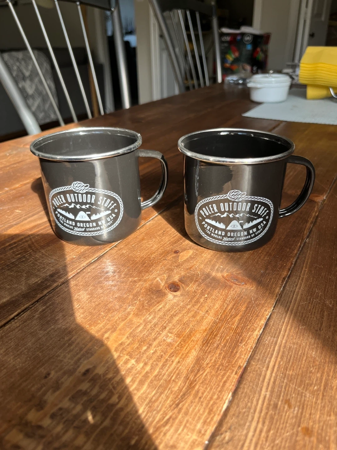 65Selling a pair of Poler Outdoor Stuff enamel mugs! They're black with the classic Poler logo. Perfect for camping or just enjoying a cozy drink at home