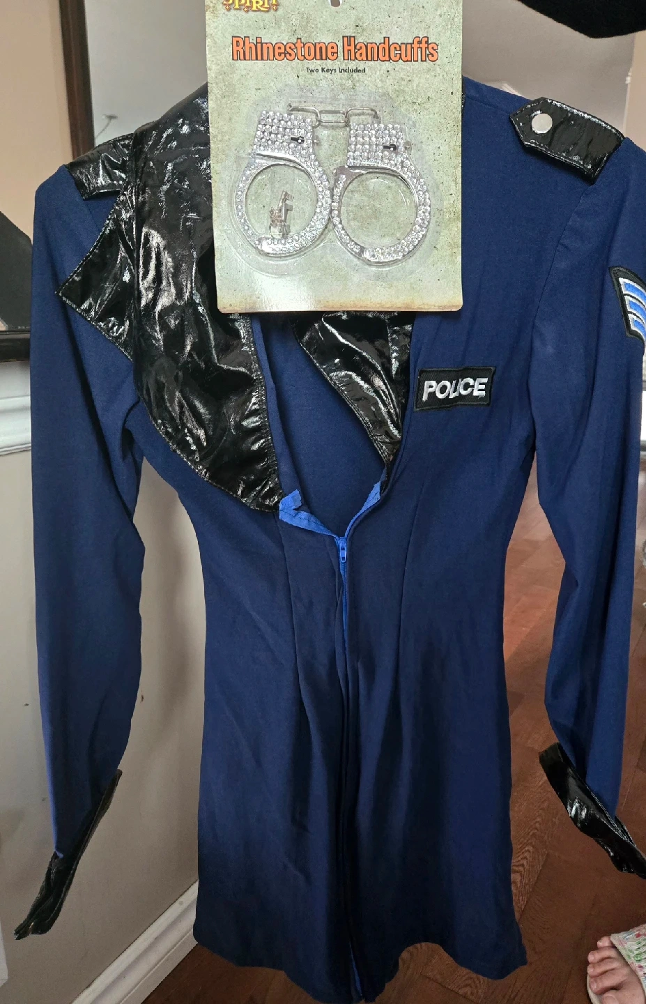 18Selling a police costume that comes with rhinestone handcuffs! The costume is blue with black accents and includes a zipper. Perfect for a fun night out or a costume party