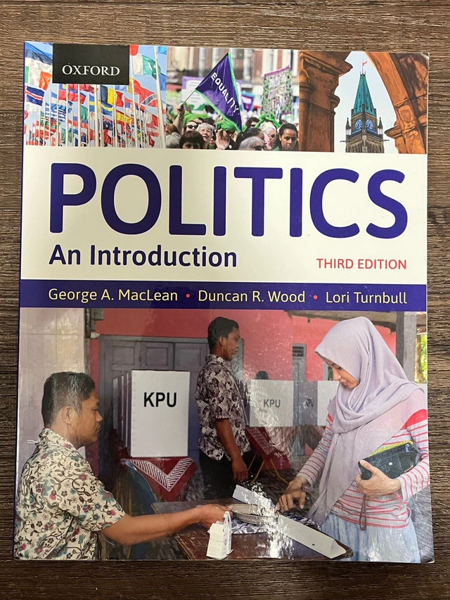 29Politics: An Introduction, Third Edition by George A. MacLean, Duncan R. Wood, and Lori Turnbull, published by Oxford University Press. Barely used. Bought this book for my first semester politics course and opened it twice or thrice I guess. Can meet up in the TMU campus or around. Cash and E-transfer accepted