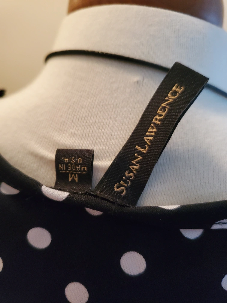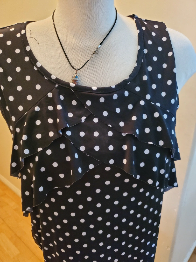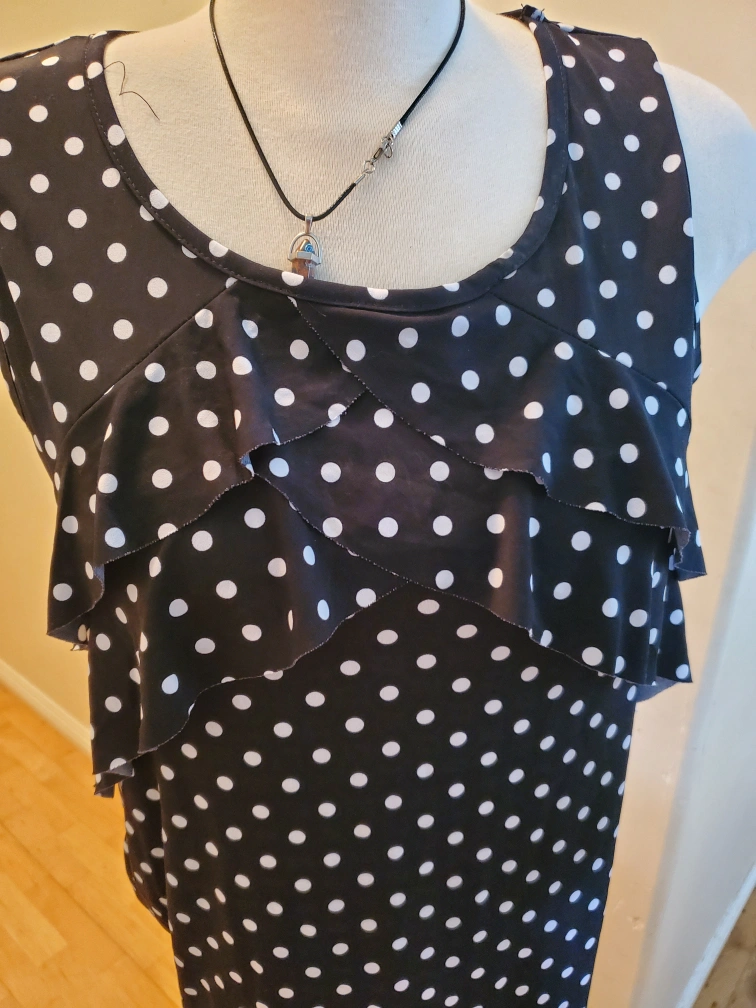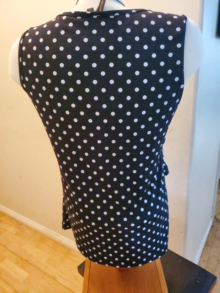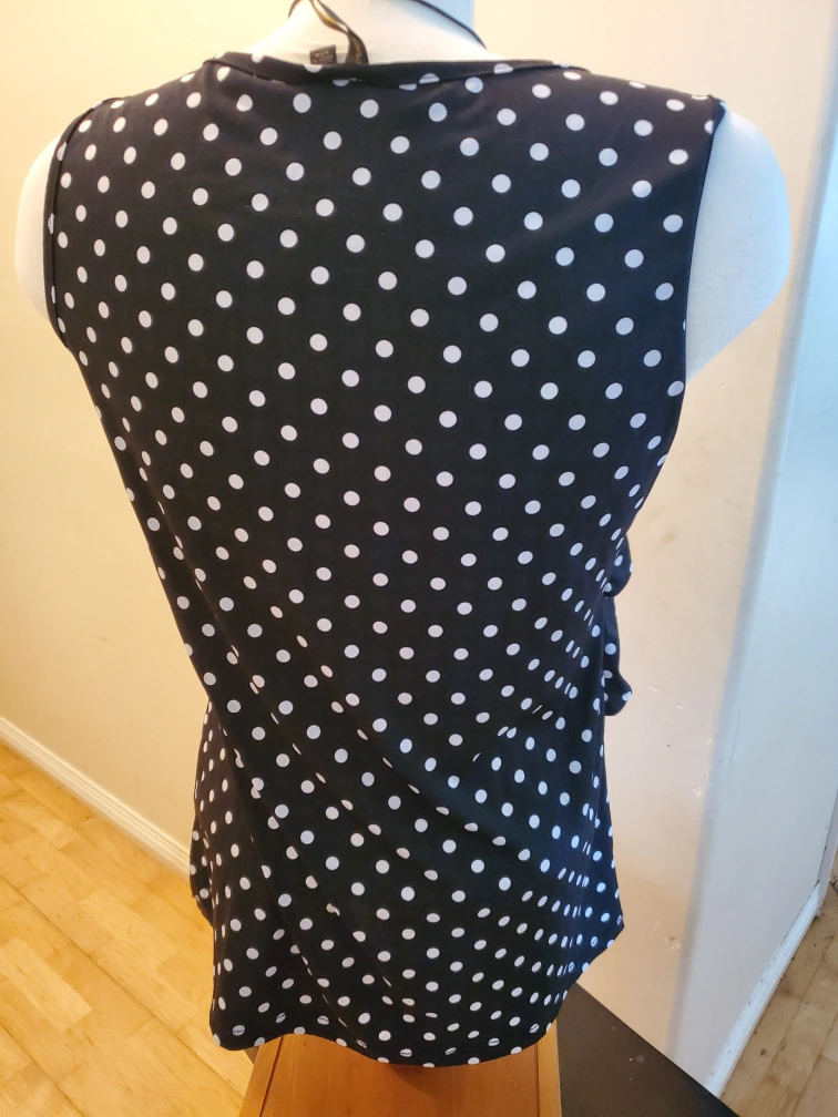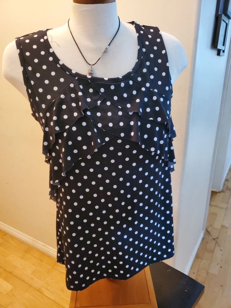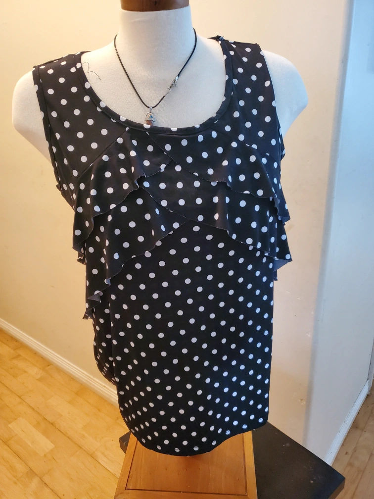 Cute polka dot sleeveless top! It's black with white polka dots and has a ruffled front. Perfect for a casual day out or dressing up for an evening event. Cedar pick up. ladies size Medium.