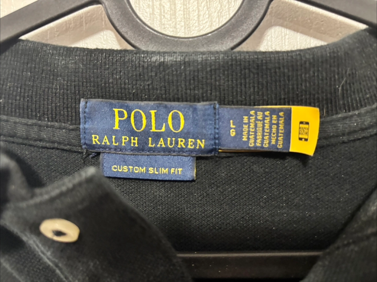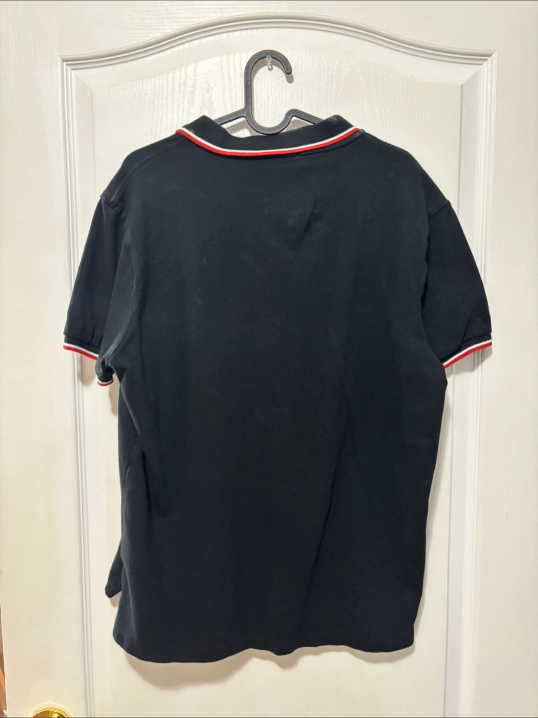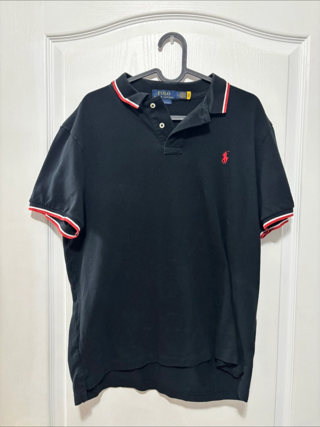 Selling a Polo Ralph Lauren polo shirt in black. It's a custom slim fit and size Large. The shirt has a red polo logo on the chest, and red and white trim on the collar and sleeves. It's in great shape and ready for a new home