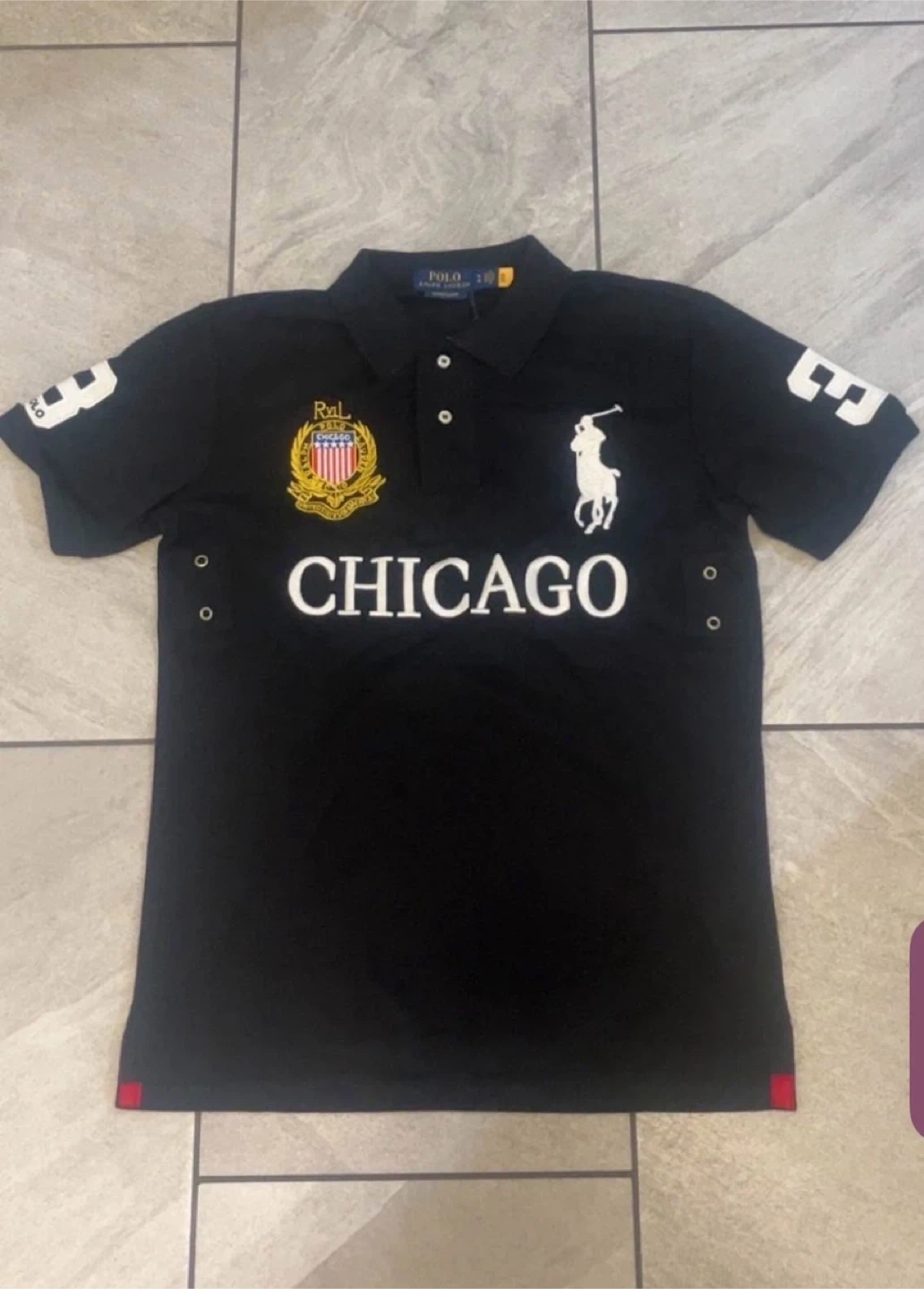 18Selling a Polo Ralph Lauren polo shirt in black. It features 'CHICAGO' in white lettering across the front, along with the iconic Polo player logo and a crest design. The number '3' is on the sleeve. A stylish addition to any wardrobe!