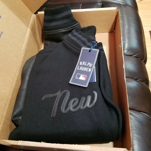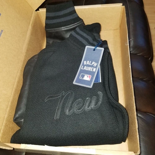 60Polo Ralph Lauren NY Yankees MLB Black Ltd Ed Leather Bomber Jacket NWT MEN SZ L Size medium has a 26½” front body length, a 26¼” back body length, a 19" shoulder, a 45” chest, and a 35½” sleeve length. Sleeve length changes 1” between sizes. Striped ribbed baseball collar. Snapped placket. Long leather sleeves with striped ribbed cuffs. Leather New York Yankees™ logo patch at the chest. Two front waist angled pockets. “Ralph” script embroidered at the right pocket. Interior left chest pocket. Leather patches spelling out “Ralph Lauren” and a leather New York Yankees™ logo patch at the center back. Striped ribbed hem. Fully lined. Shell: wool, polyester. Sleeves: leather. Ribbed trim: acrylic, wool. Body lining: cotton. Sleeve lining: polyester. Dry clean by a leather specialist. Imported. Due to the natural characteristics of this material, the coloring may rub off onto fabrics and upholstery.