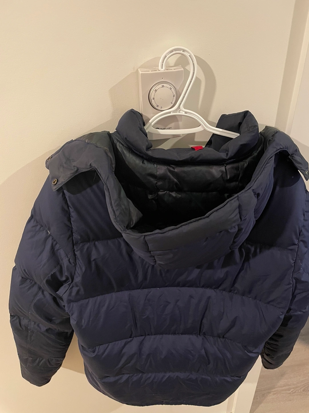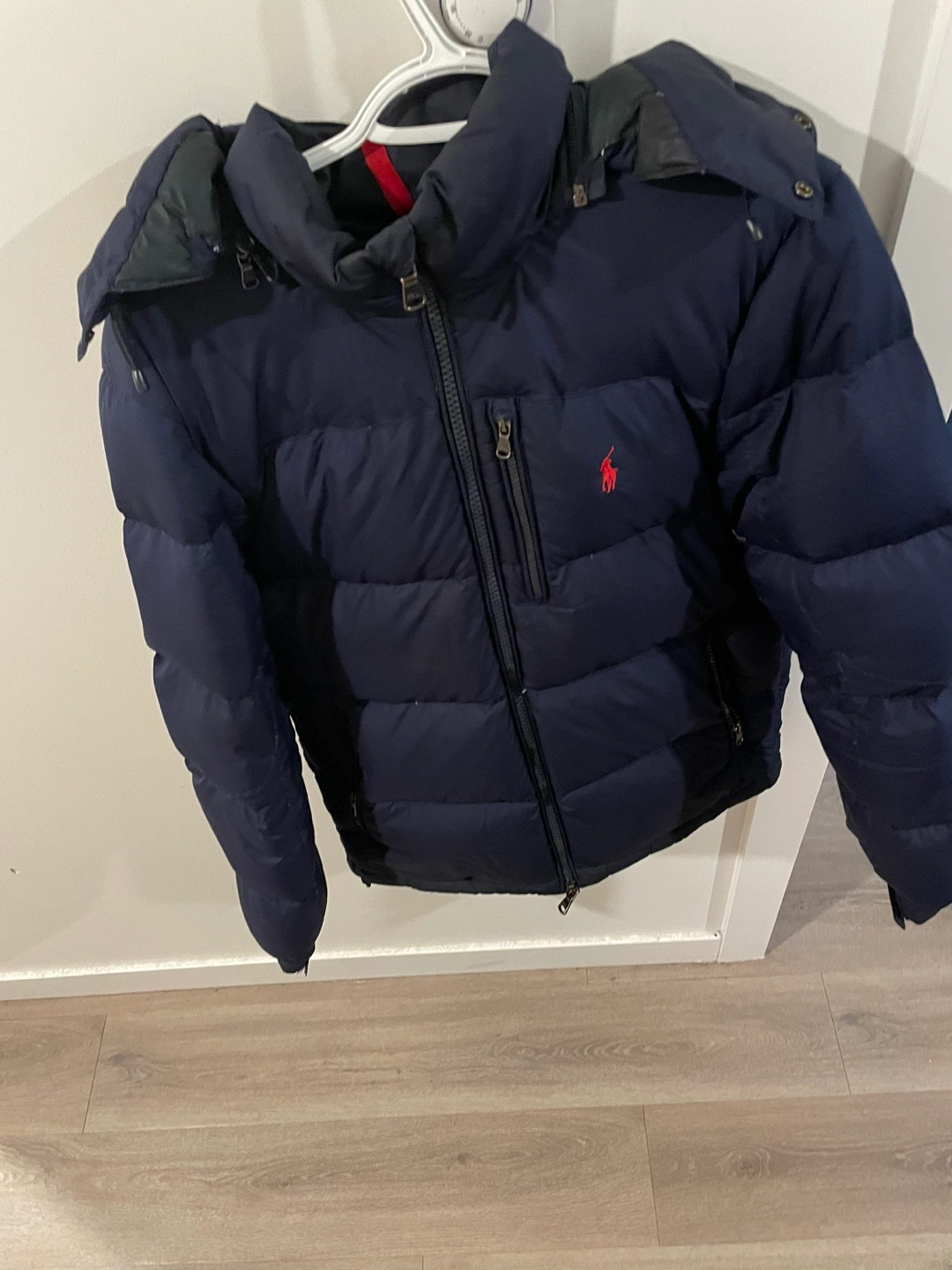 130Men's blue puffer jacket. Features a hood and zipper closure.