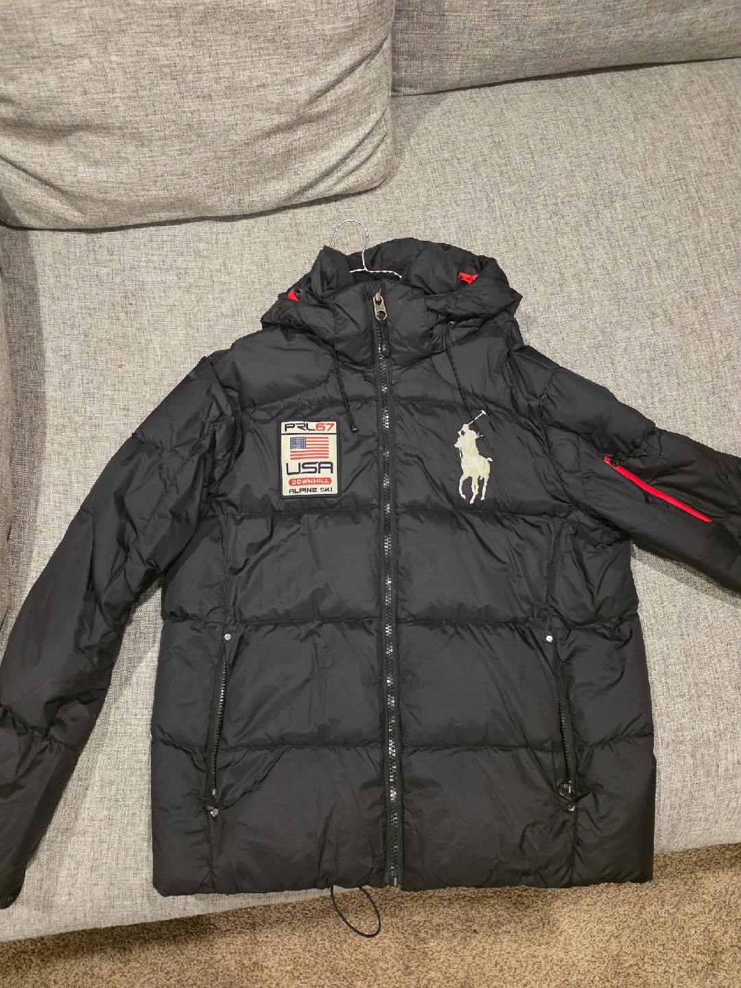 Selling a Polo Ralph Lauren jacket in great condition! It's a black puffer jacket with a hood. Features the PRL67 USA Alpine Ski patch on the chest and the classic Polo logo on the other side. Perfect for staying warm this winter!