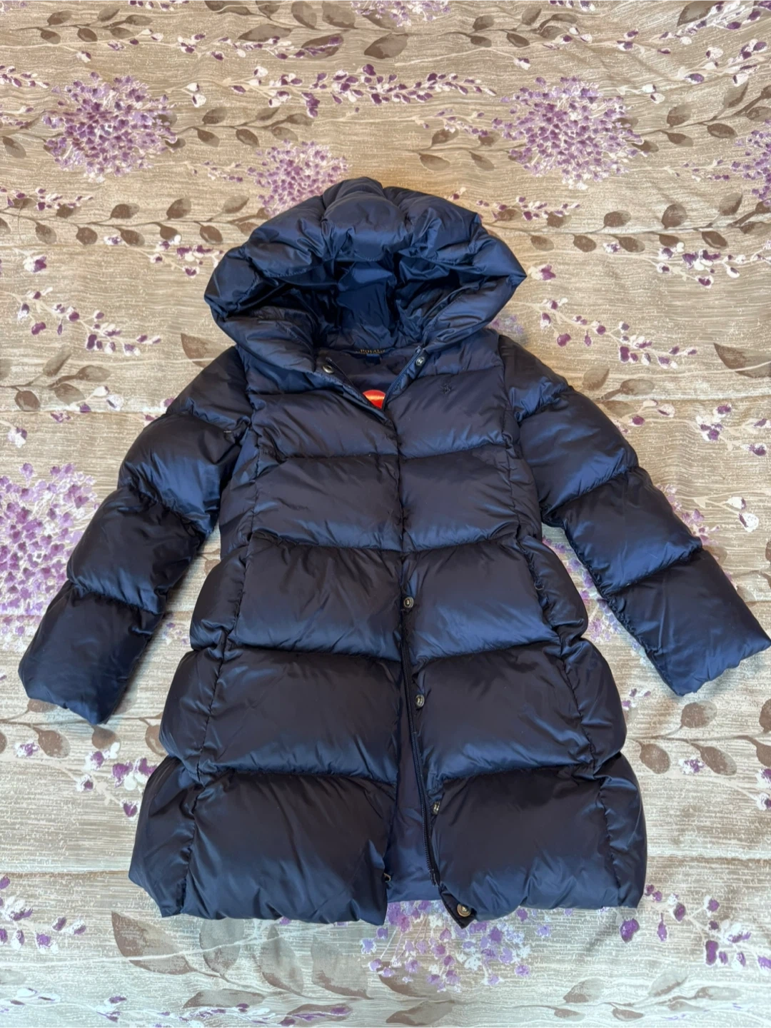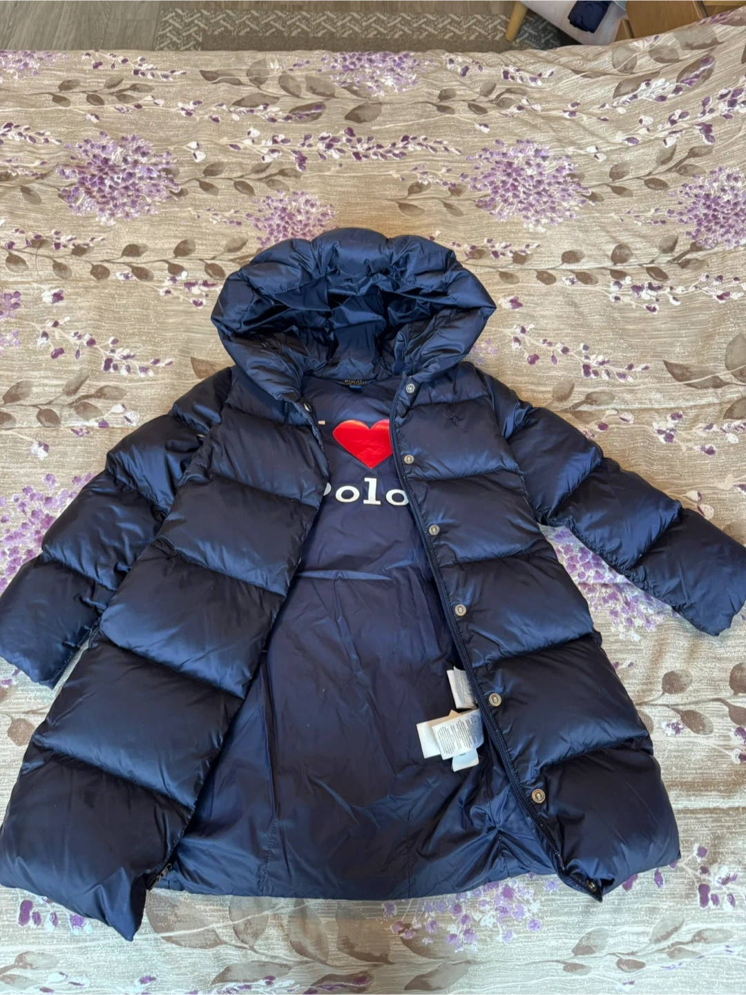 Selling a Polo Ralph Lauren puffer jacket in great condition! It's a size 6 and features a hood and a stylish design. The jacket is a beautiful navy colour.