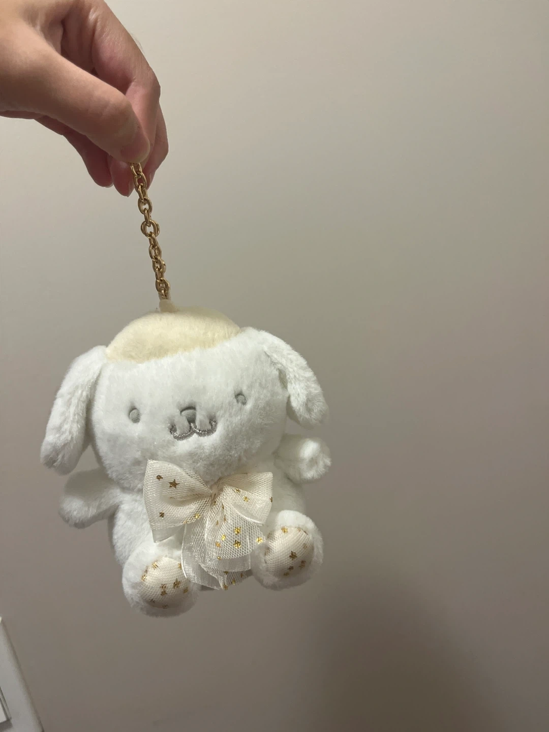 Super cute Pompompurin plush keychain! It's in great condition and ready to find a new home. The plush is white with a little bow and a gold chain. Can use it on a bag or for any decoration. A perfect gift for children or adults who loved Sanrio character.
