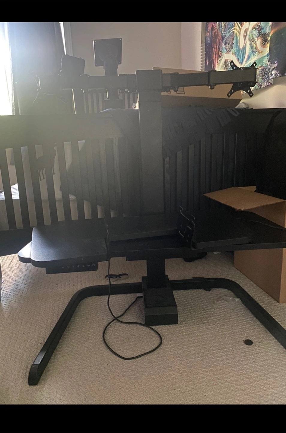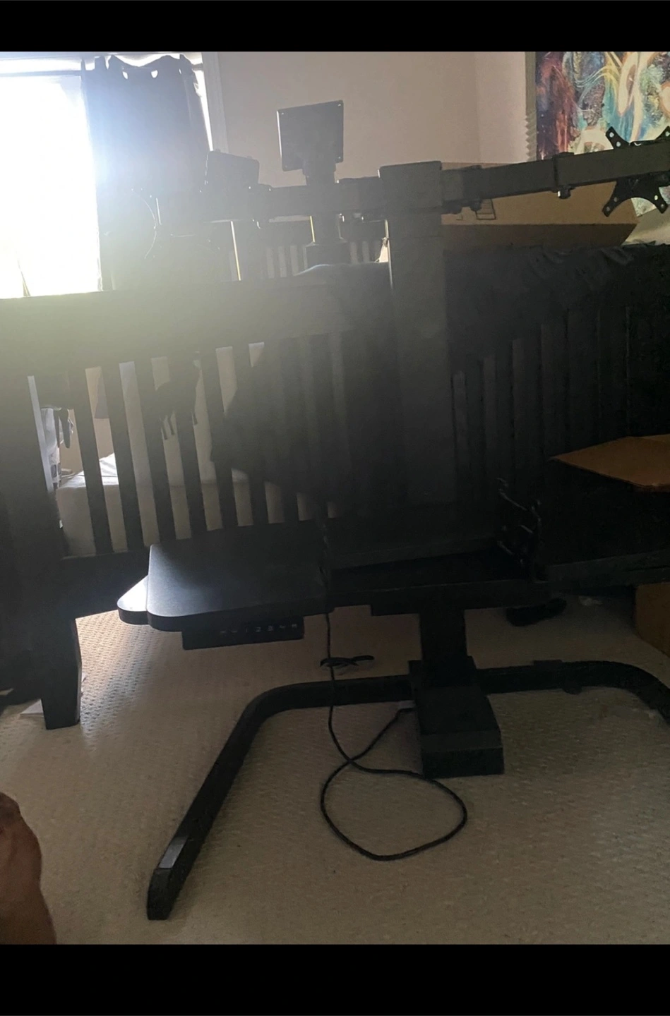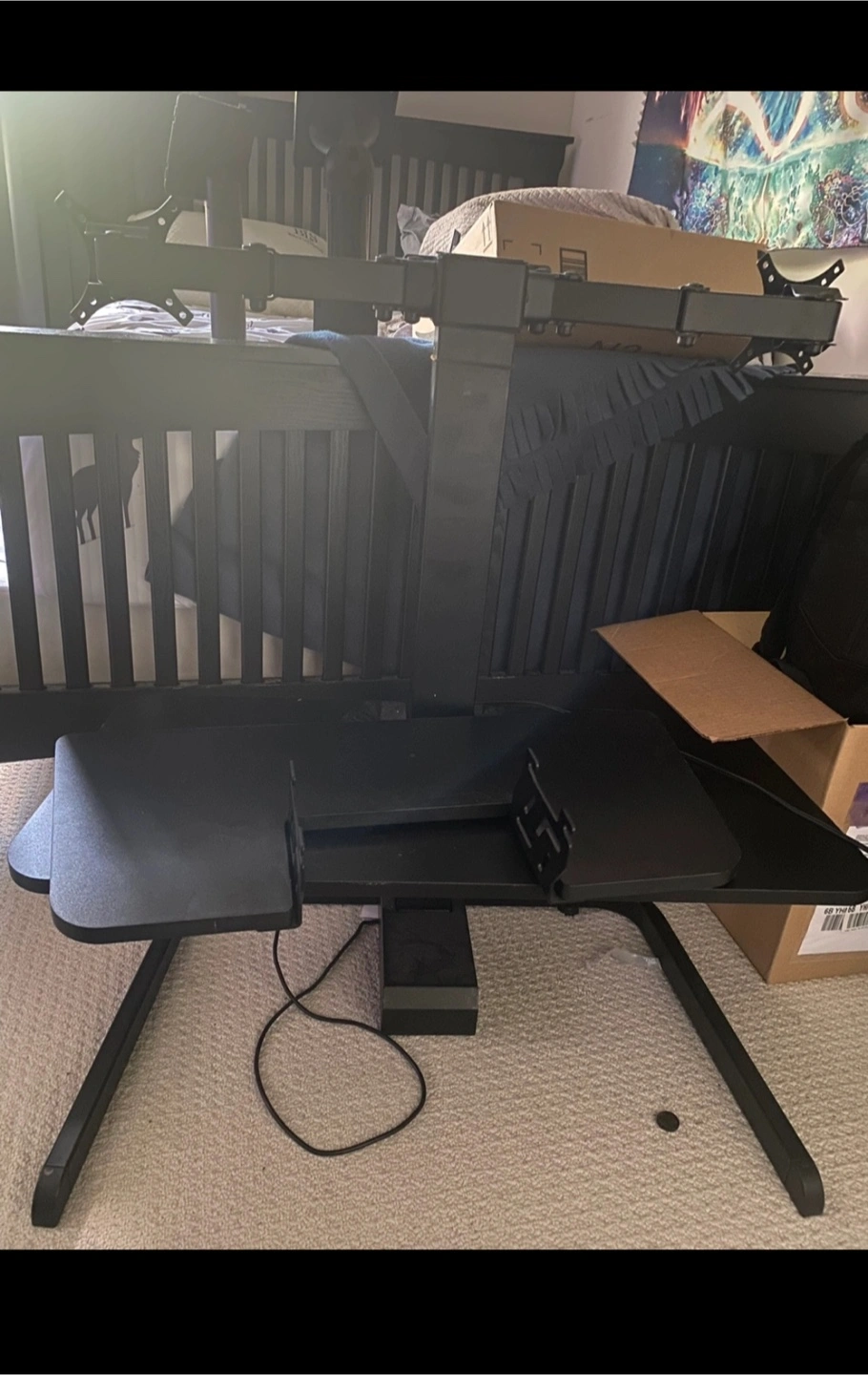 Black standing desk converter. Features adjustable height and monitor mount. Small damage to corner. Includes keyboard tray.