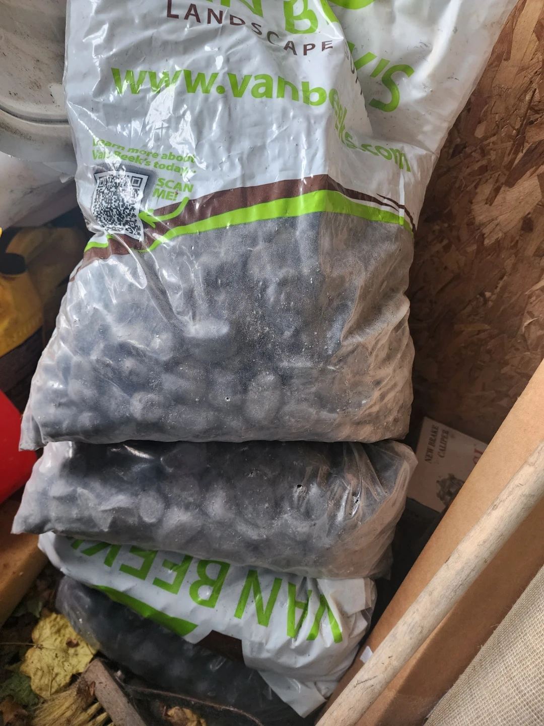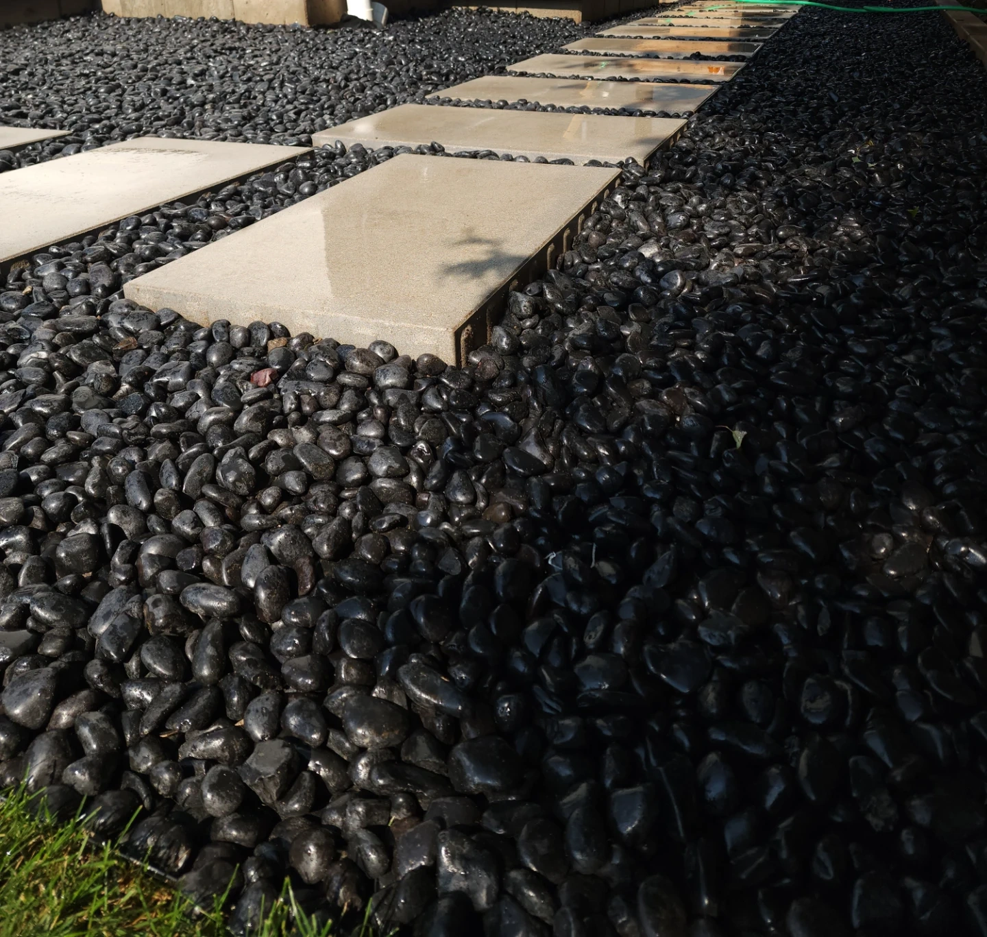 Black polished pebbles from Van Beek's Landscape Supply. These are 1" to 1.5" in size. They're great for landscaping projects. Plenty of bag's available!