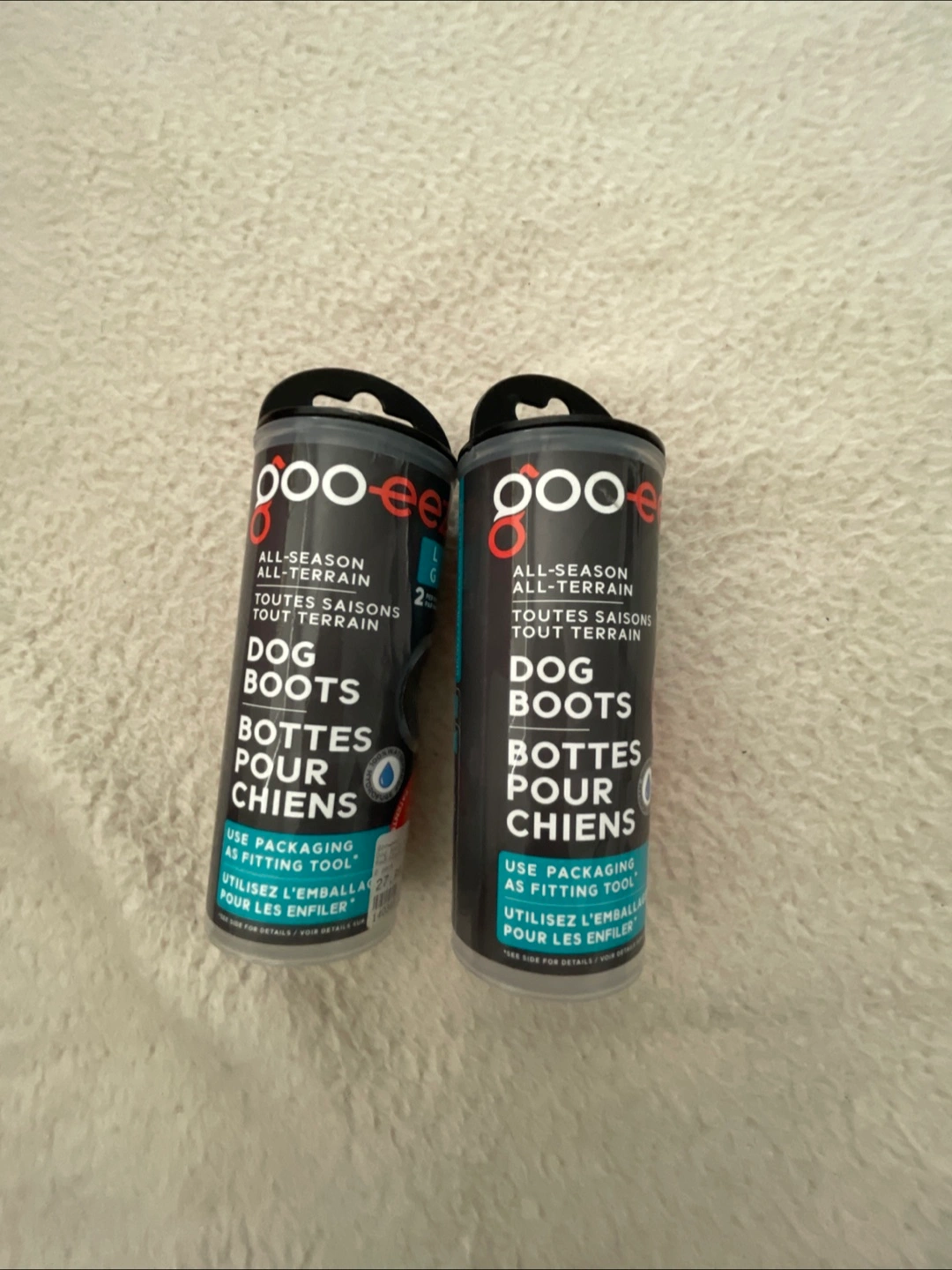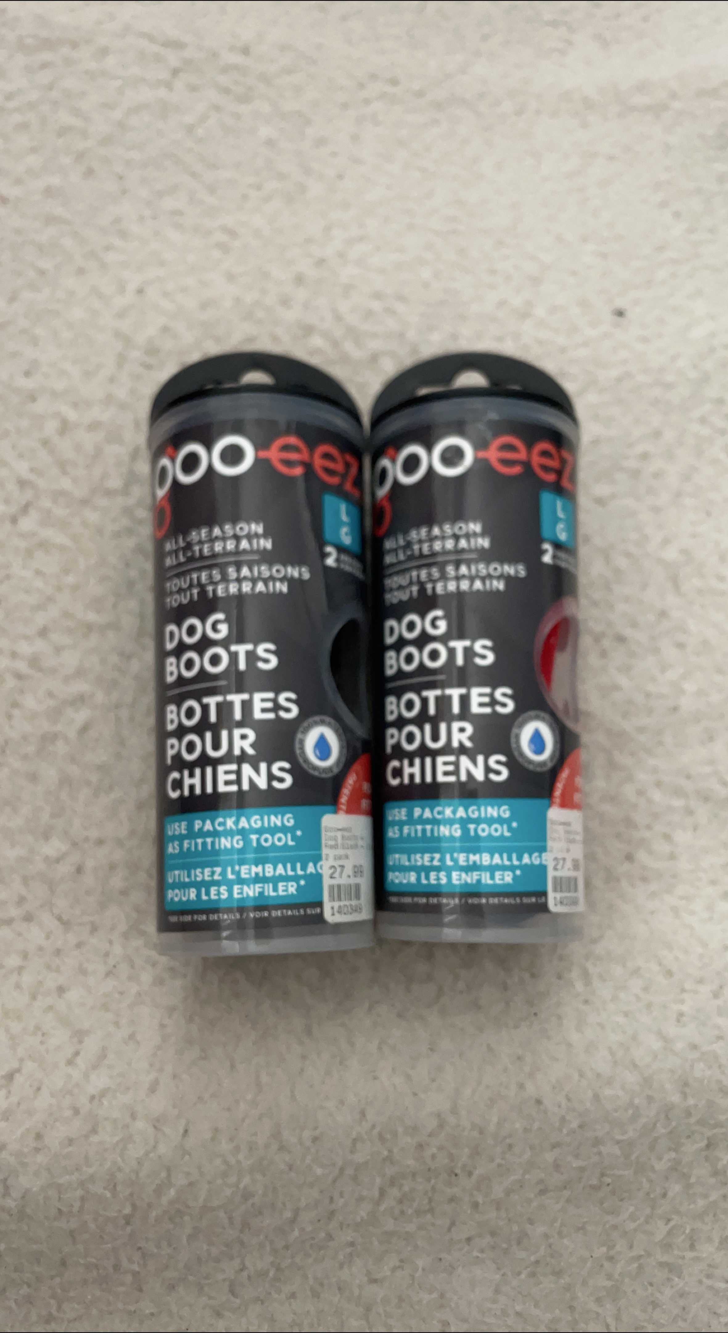 Selling a pair of Poo-eez All-Season All-Terrain dog boots in size L. These are perfect for protecting your furry friend's paws in all weather conditions. The packaging can even be used as a fitting tool! Originally bought for $27.99. Selling for $20 each obo or $30 for both obo They are Essentially new, never used outside. I attempted to put them on my dog but they didn’t fit.