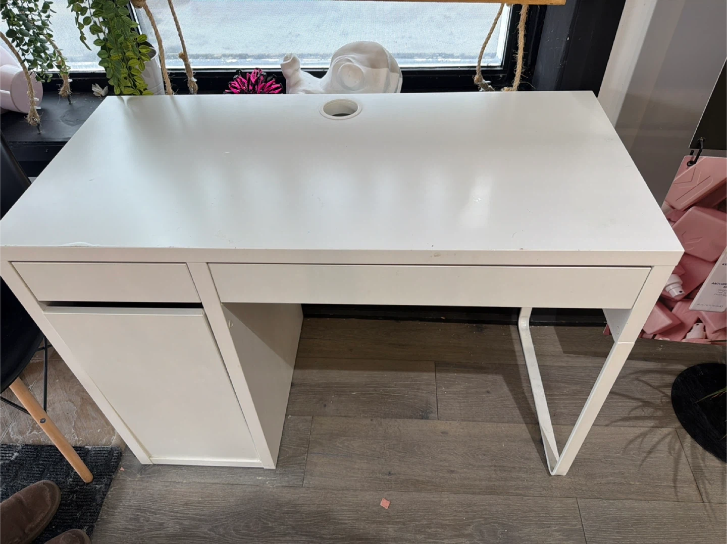 A simple white desk with a built-in drawer and a cable management hole on top. It's a handy spot for your computer and writing essentials. This desk is good for a smaller workspace.
