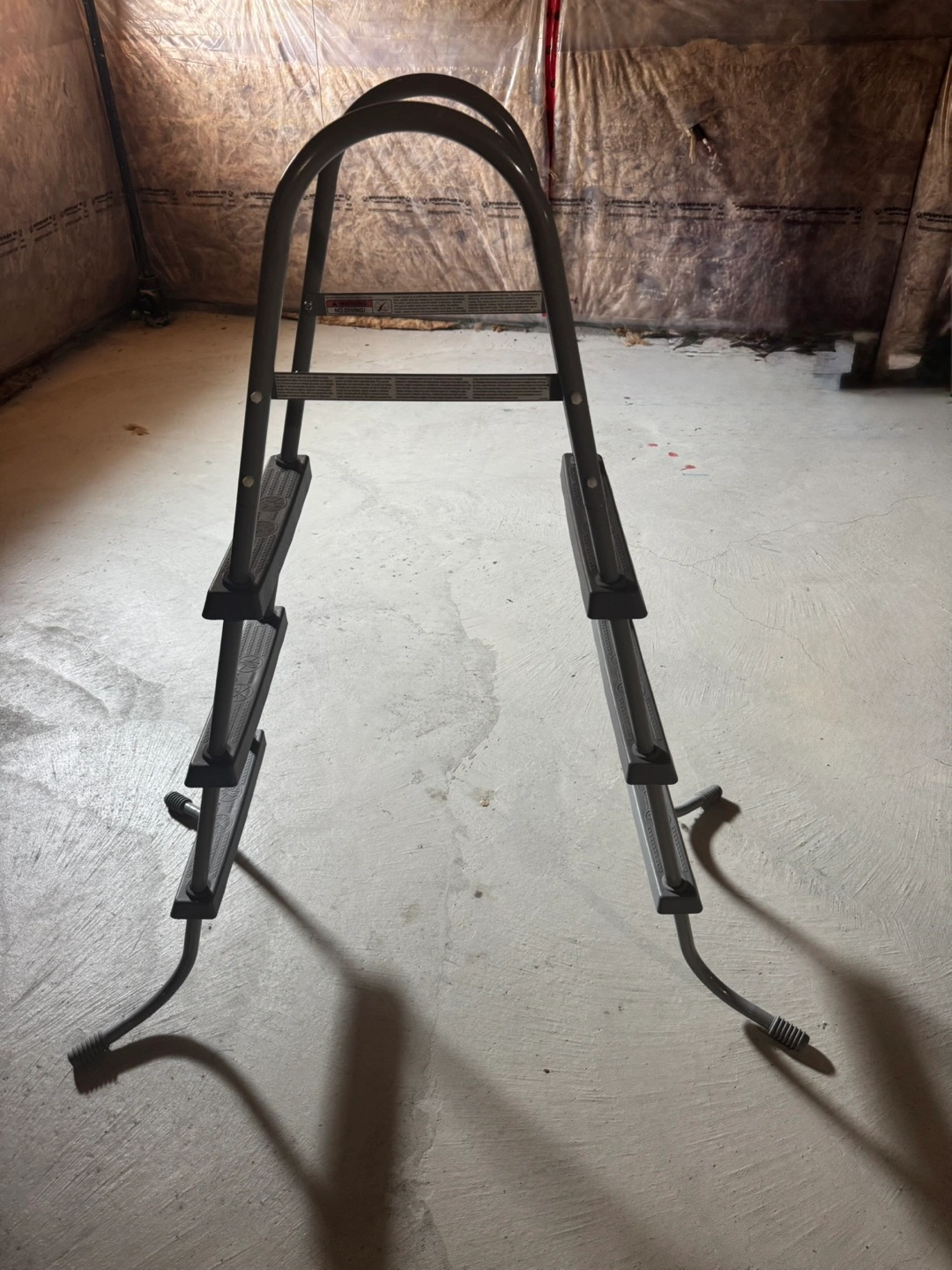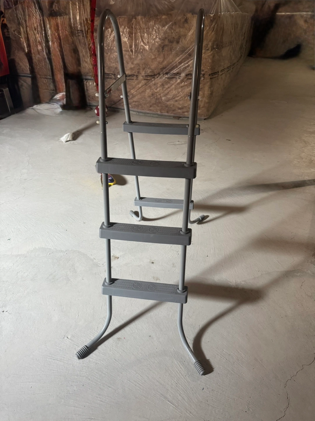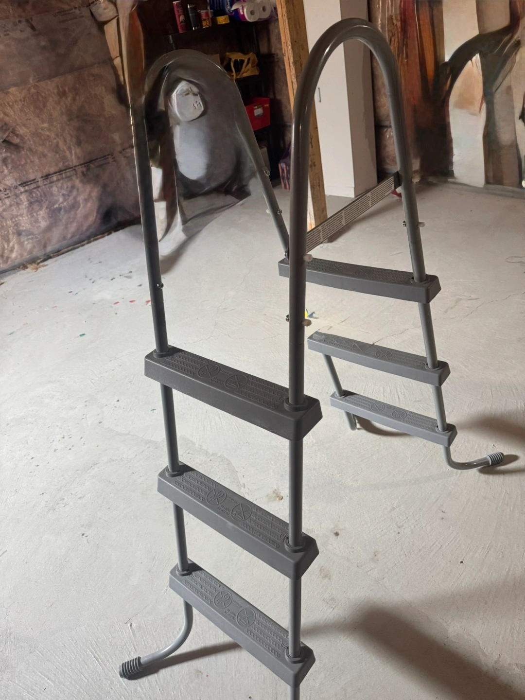Selling a used above ground pool ladder in gray. It has a few steps for easy climbing in and out of the pool. Perfect for summer fun!