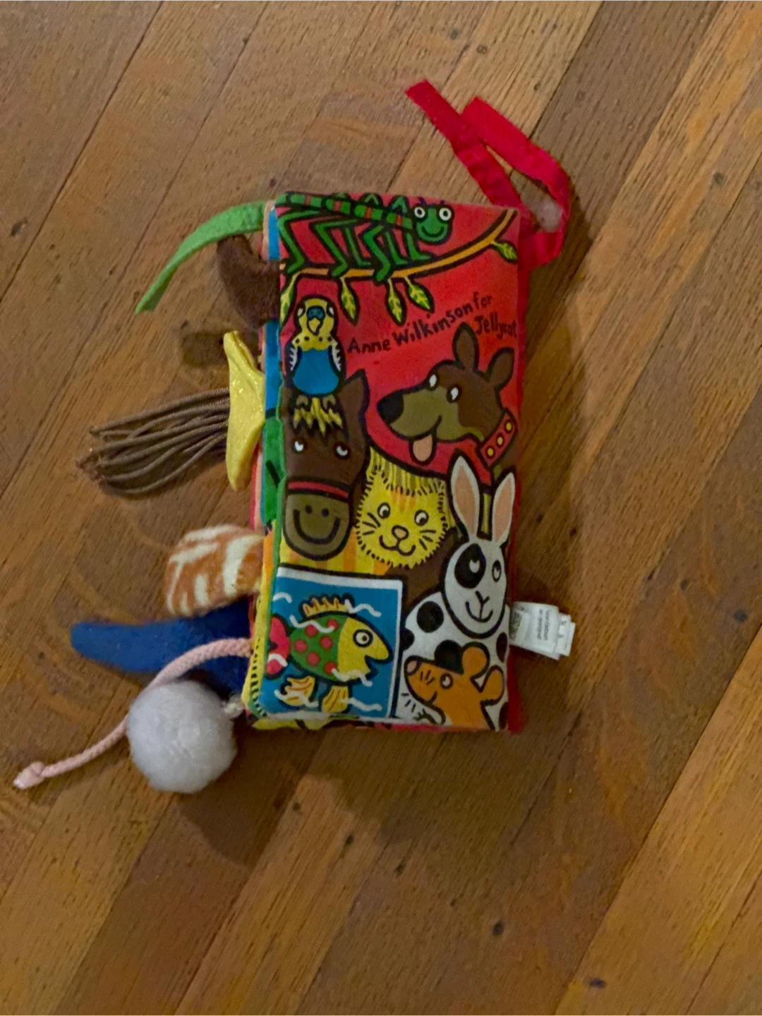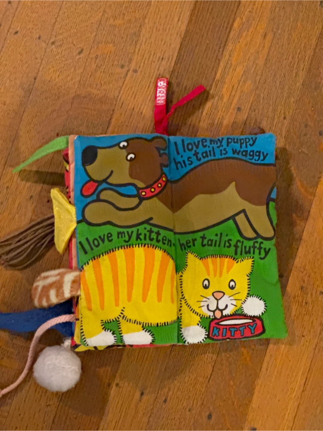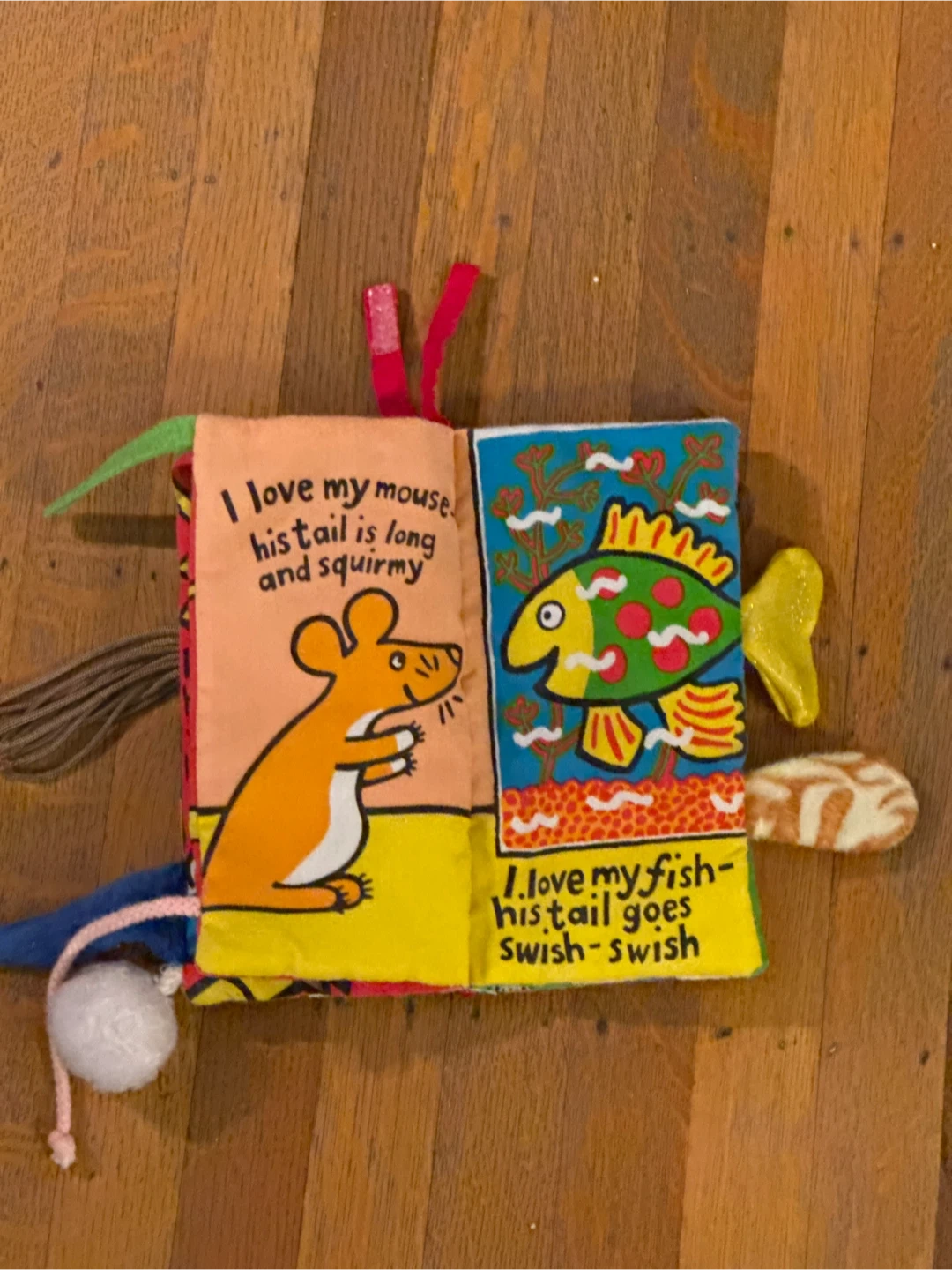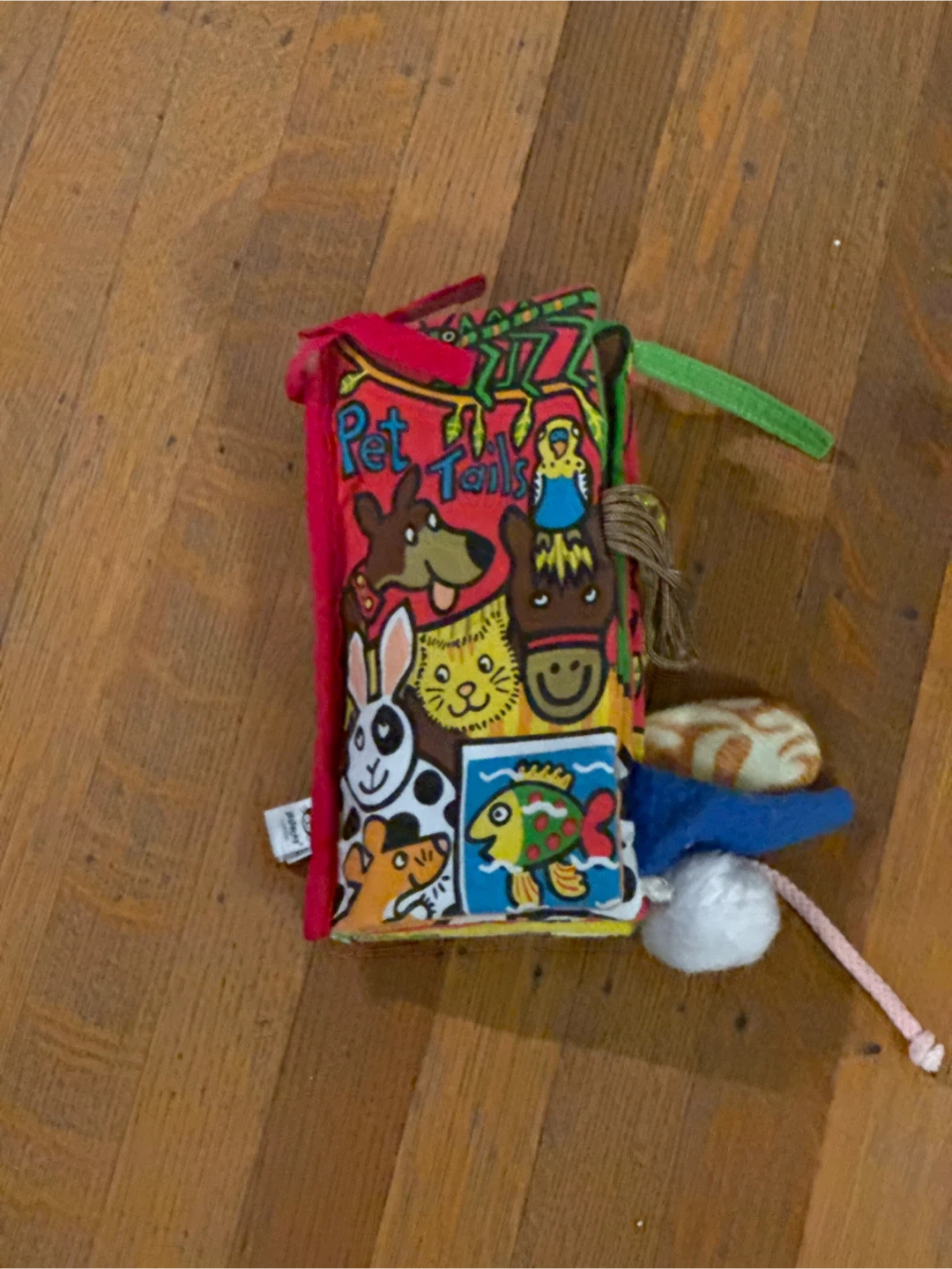 This is a cute soft book for babies called Pet Tails! Each page features a different animal and a little rhyme about their tail. It's in great condition and perfect for little hands to explore