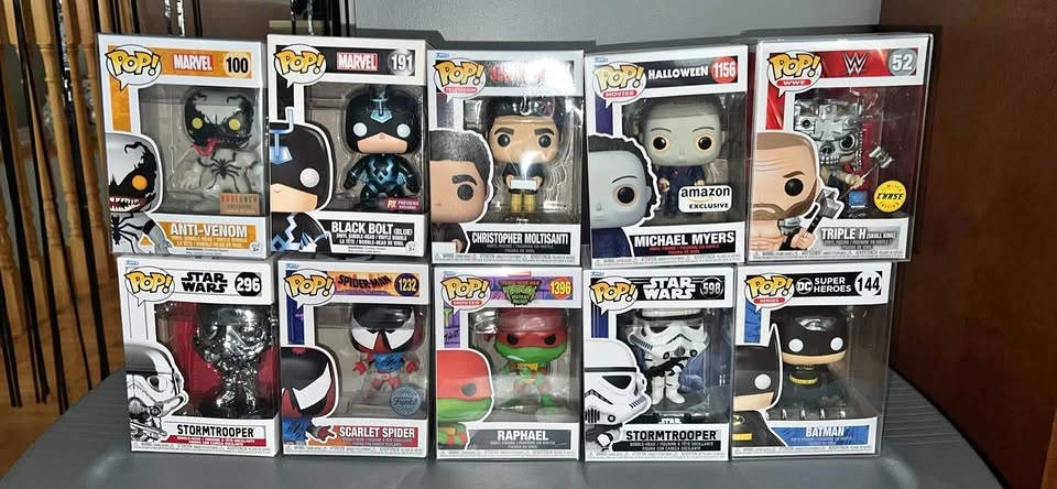 Anti Venom #100-50$ Stormtrooper chrome #296-55$ Black Bolt #191-40$ Scarlet Spider #1232-60$ Chris Moltisanti #1294-40$ Raphael #1396-40$ Michael Myers #1156-38$ Stormtrooper #598-35$ Triple H (skull king) #52-75$ Batman #144-45$ Let me know if you're interested!