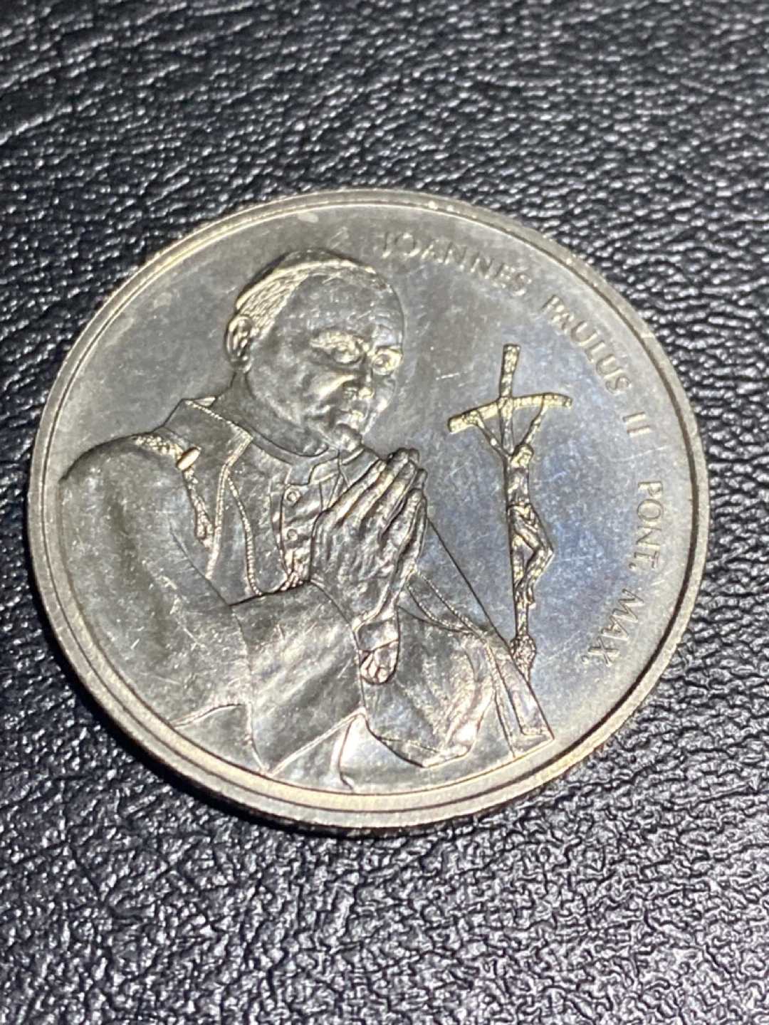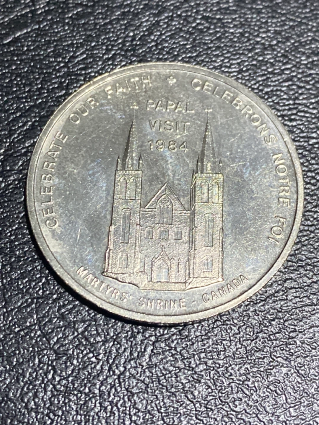 Selling a commemorative coin from Pope John Paul II's 1984 Papal Visit to Canada. The coin commemorates the event with an image of the Pope and a depiction of Martyrs' Shrine.