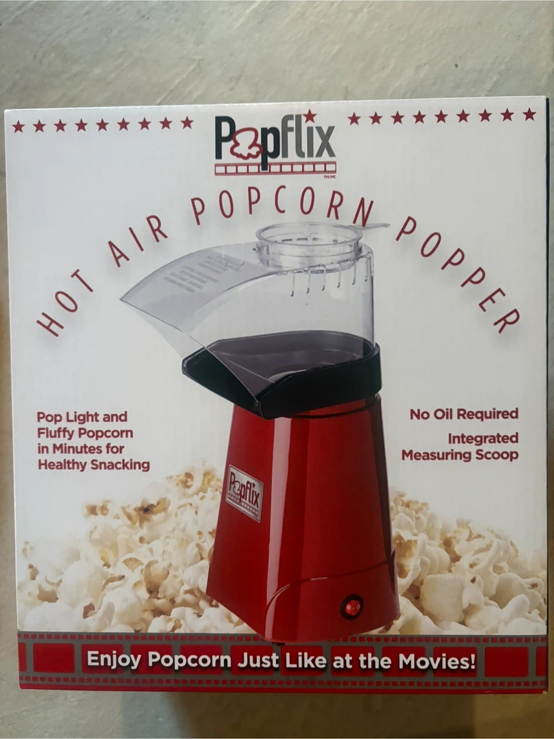 Enjoy fresh, hot popcorn in minutes with this Popflix hot air popcorn popper! It pops light and fluffy popcorn for healthy snacking. No oil is required, and it includes an integrated measuring scoop. Enjoy popcorn just like at the movies!