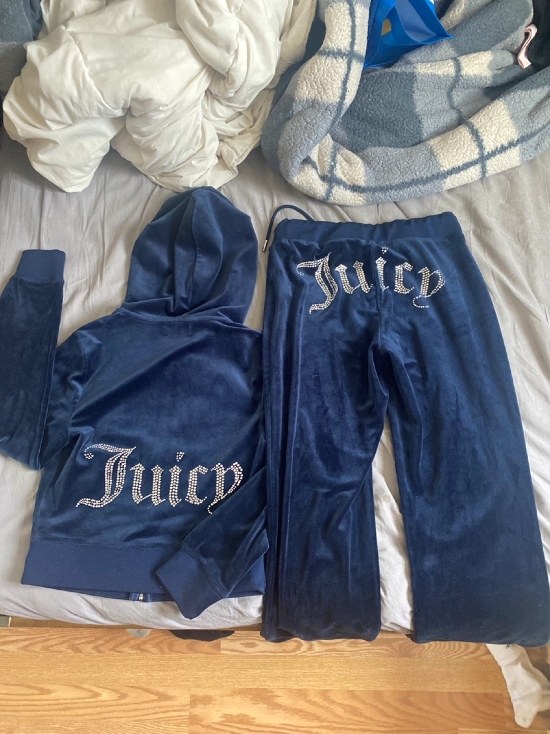 A navy blue velour tracksuit set from Juicy Couture. It includes a zip-up hoodie and matching pants, both embellished with rhinestones. This comfy set is perfect for loungewear!