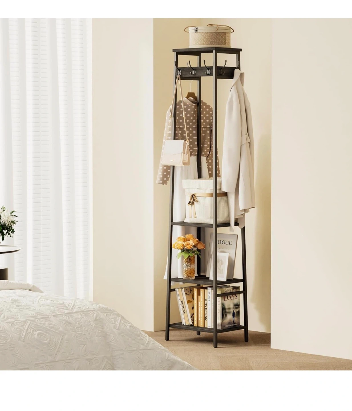 Black Freestanding Coat Rack with 3 Shelves and 7 Hooks
