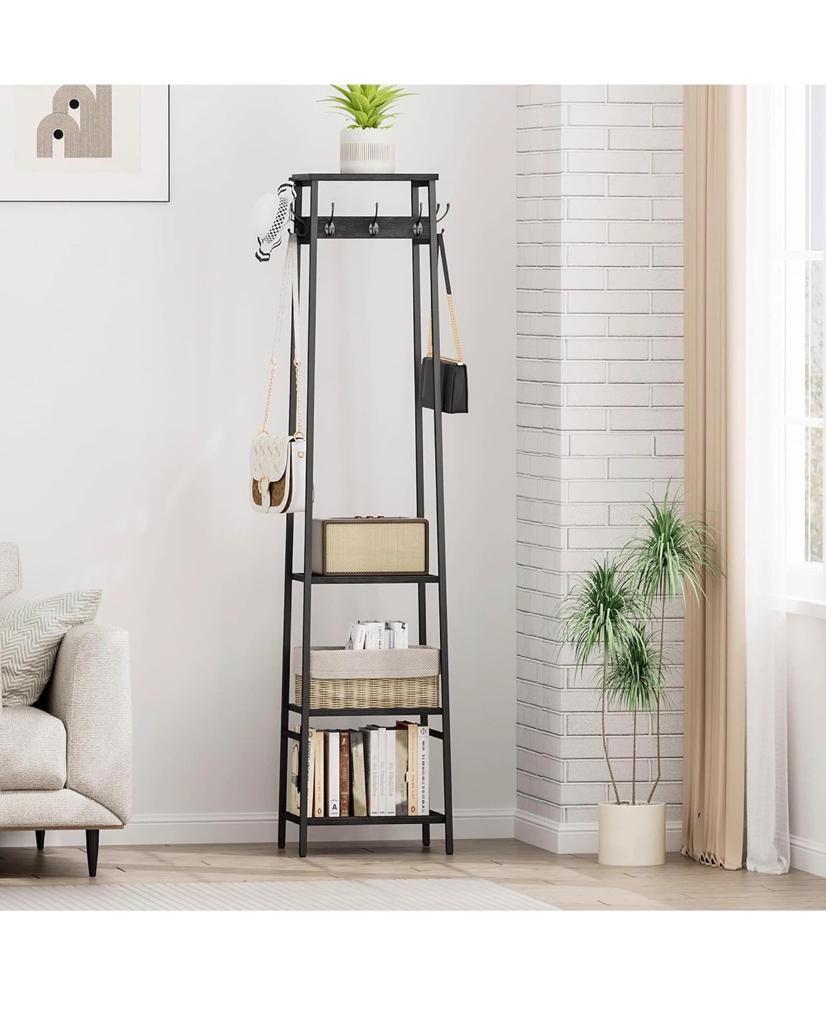 This black coat rack stand features 3 shelves for storage and 7 hooks for hanging items. It's constructed with metal and a wood-look finish. Dimensions are 70.9" H x 16.1" W x 12.2" D. It's a great way to organize your entryway!