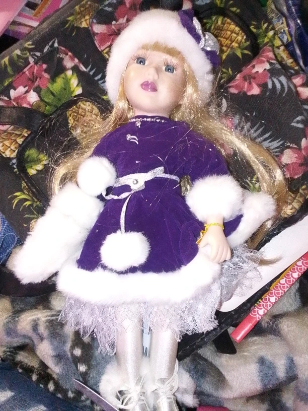 24A beautiful porcelain doll dressed in a purple and white outfit. It's in great condition and would make a lovely addition to any collection!