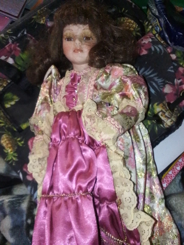 24Selling a beautiful porcelain doll. She's wearing a lovely pink dress with floral accents. She would be a great addition to any doll collection!