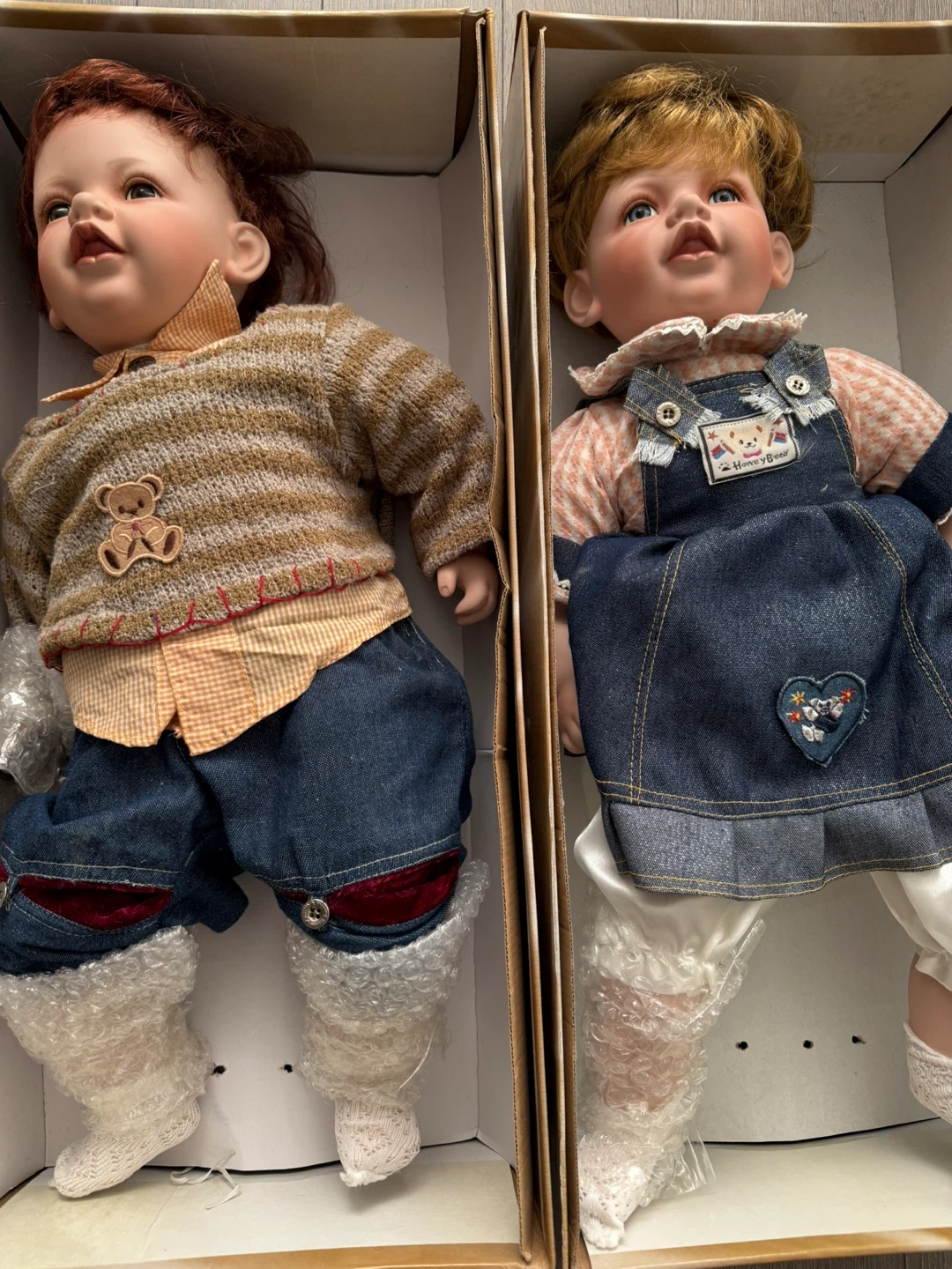 Two porcelain dolls in their original boxes! They're both dressed in cute outfits, one in a striped sweater and the other in a denim dress. A charming addition to any collection