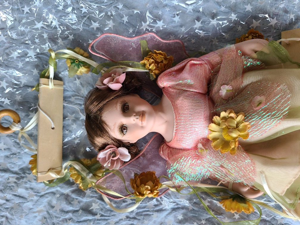 455Beautiful porcelain doll, adorned in a pink and green dress. Features brown hair and large eyes. Comes with wings and flowers. hanging on wooden swing. Appears to be collectible.