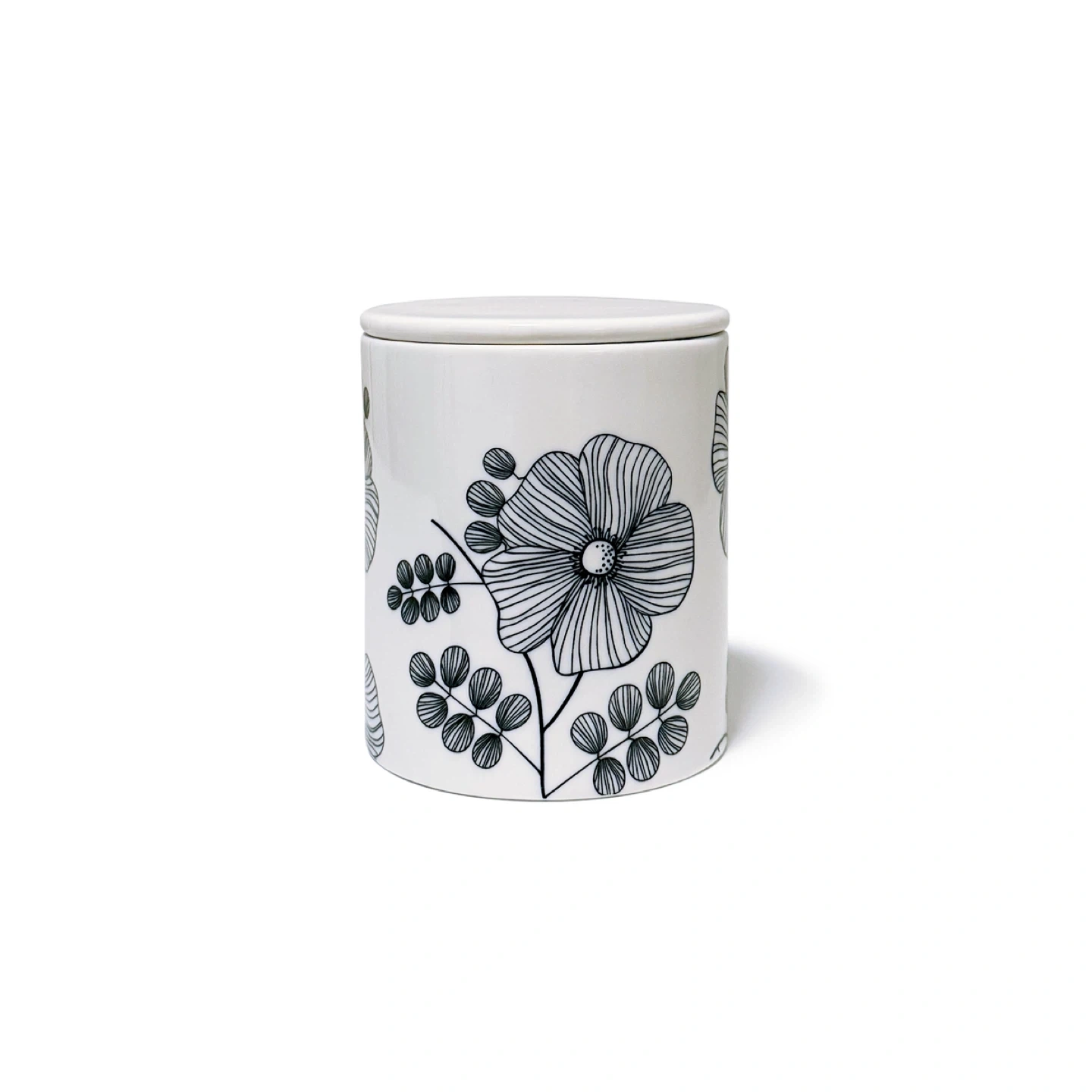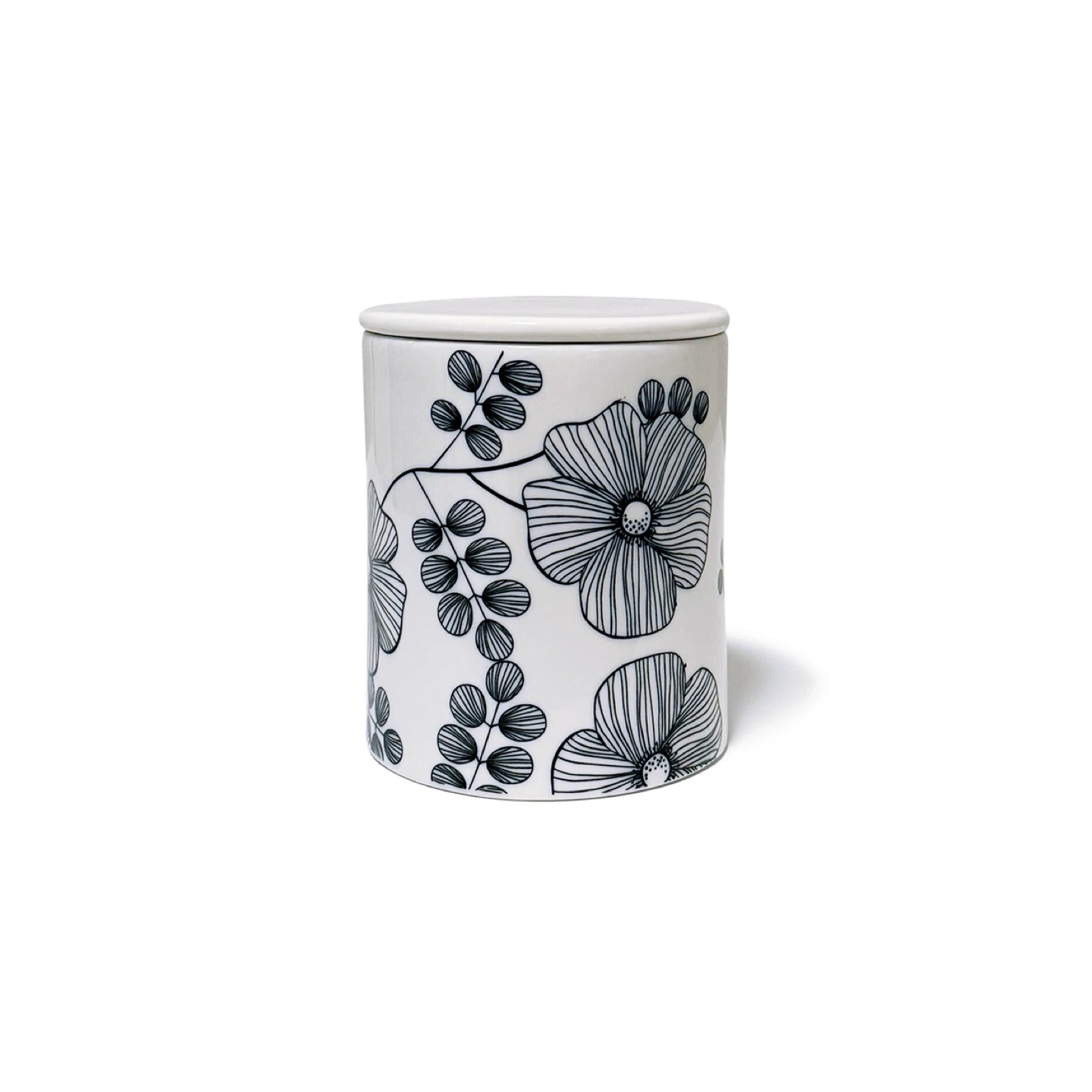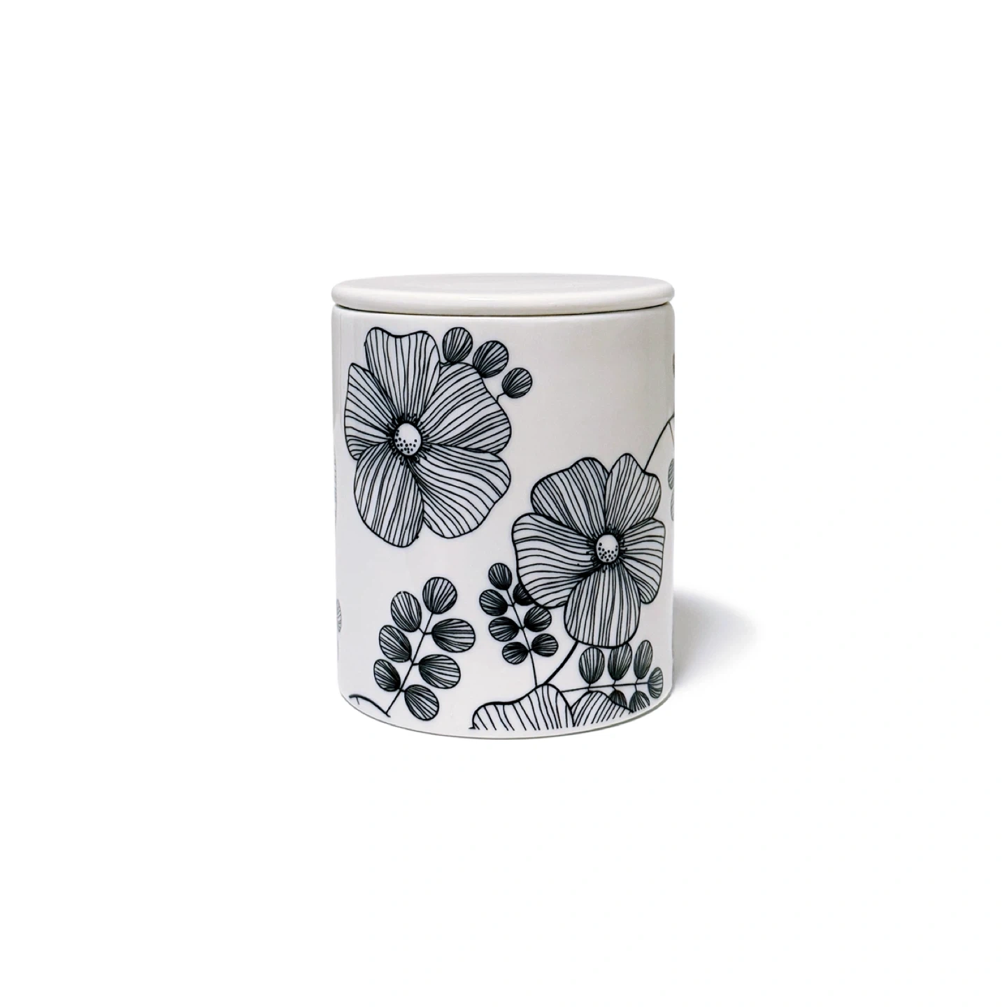 A lidded porcelain jar with a floral pattern. Can be used for storing cotton rounds, q-tips, or other small toiletries. Very good condition. No flaws. Unknown brand. Had a brand sticker at the bottom which was removed. Thoroughly cleaned. Comes from a smoke-free, pet-free household. Colour: White w/black pattern Material: Porcelain Dimensions: 3.4 x 4” / 8.7 x 10.3 cm Year: 2011