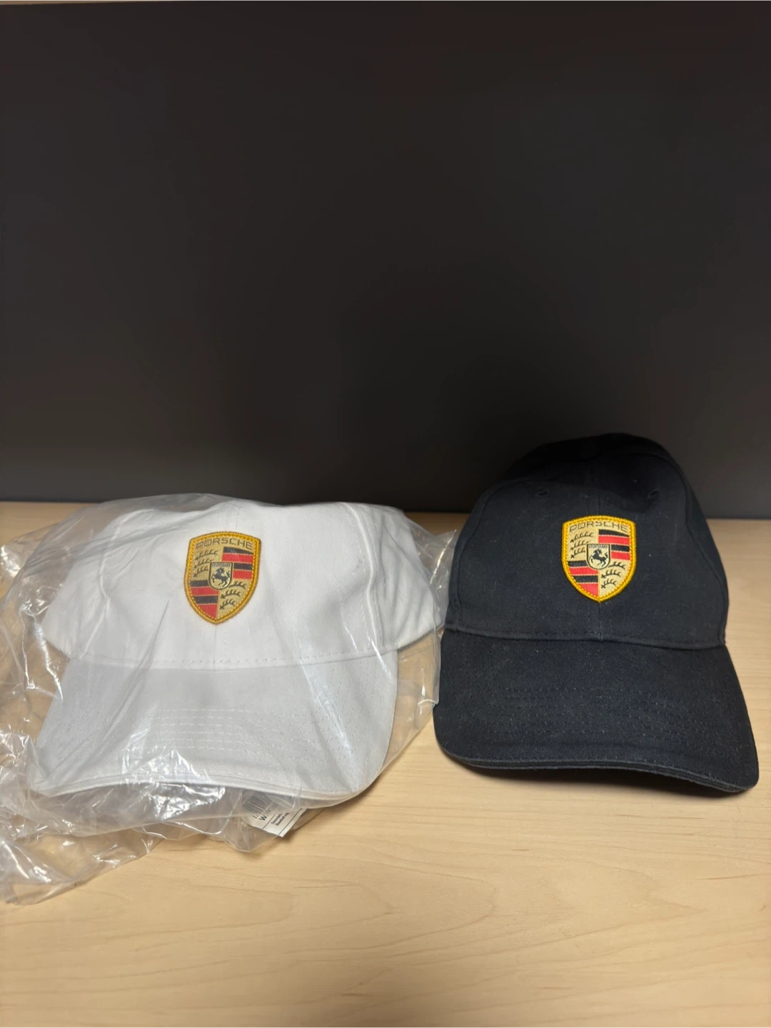 Selling a pair of Porsche baseball caps! One is black and the other is white. Both have the Porsche logo embroidered on the front. The white one is still in its original packaging!