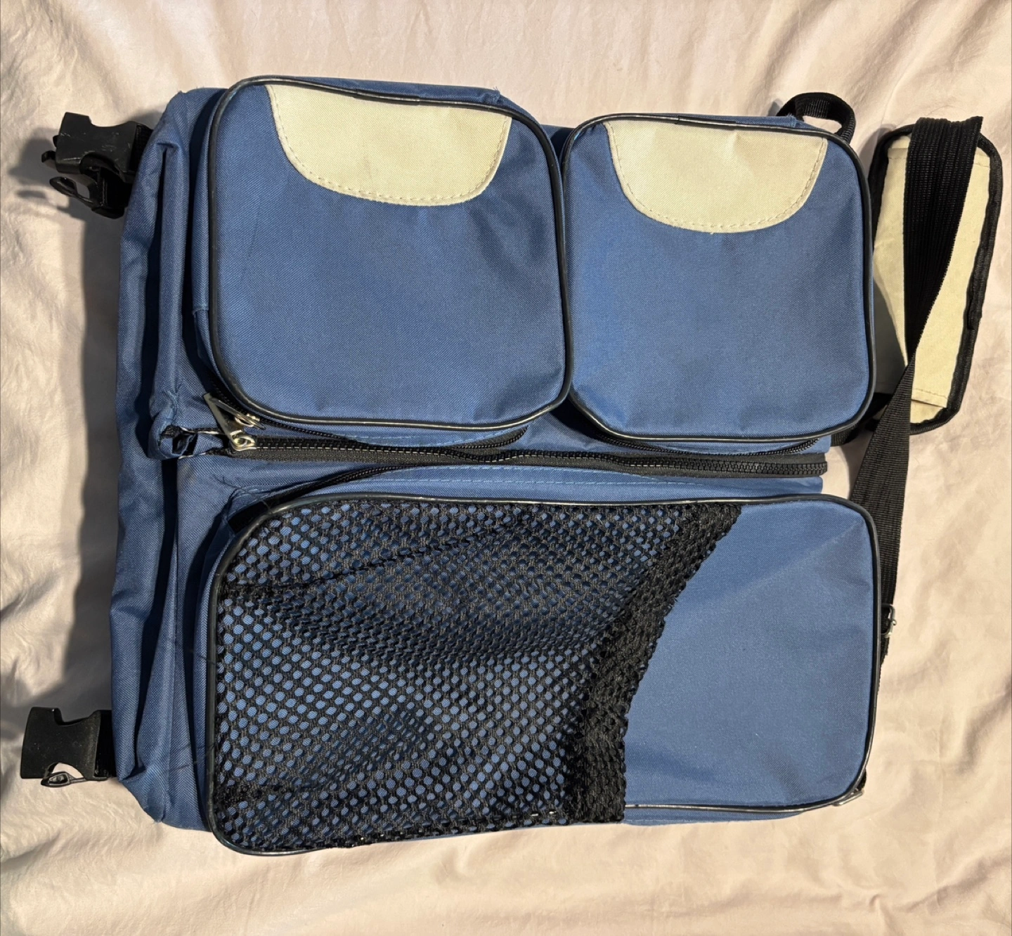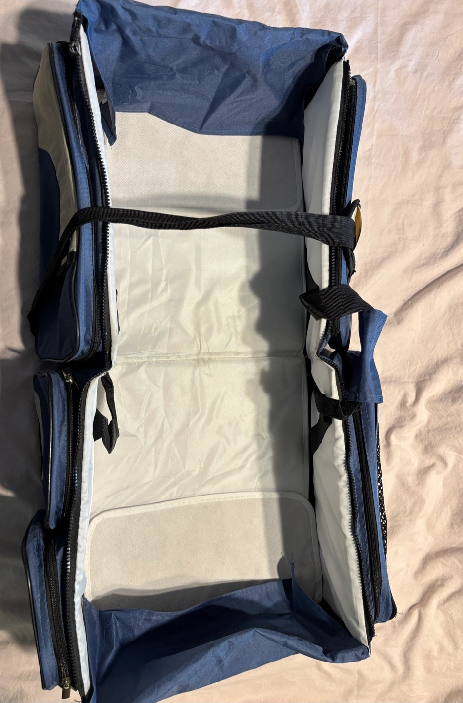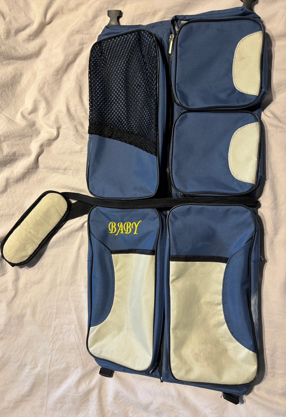 97Blue and beige portable baby bassinet. Folds flat for easy storage and transport. Multiple pockets for storage. Shoulder strap included. Ideal for travel, camping, etc