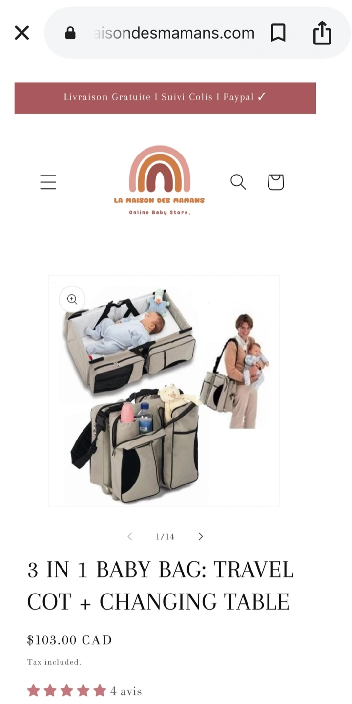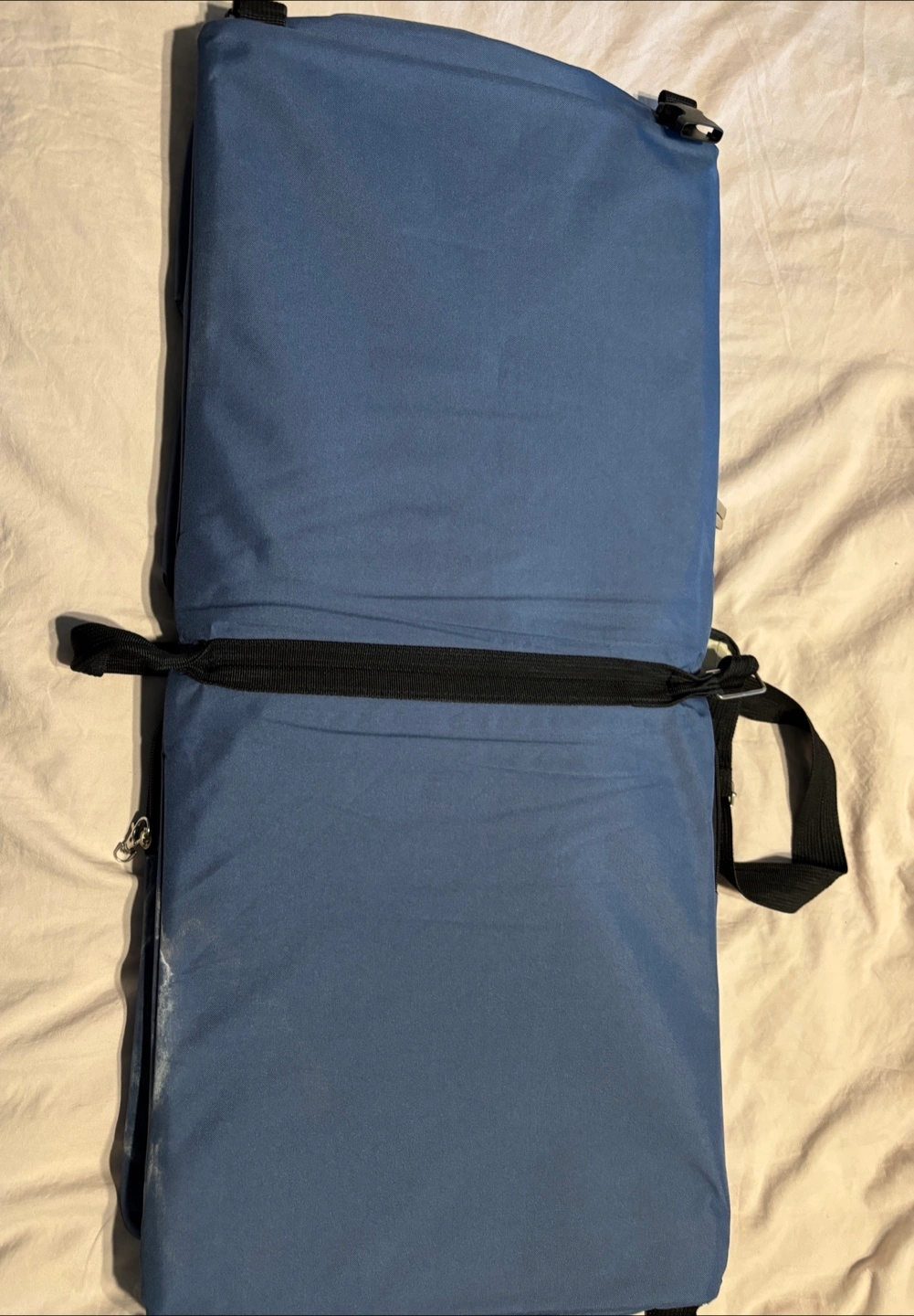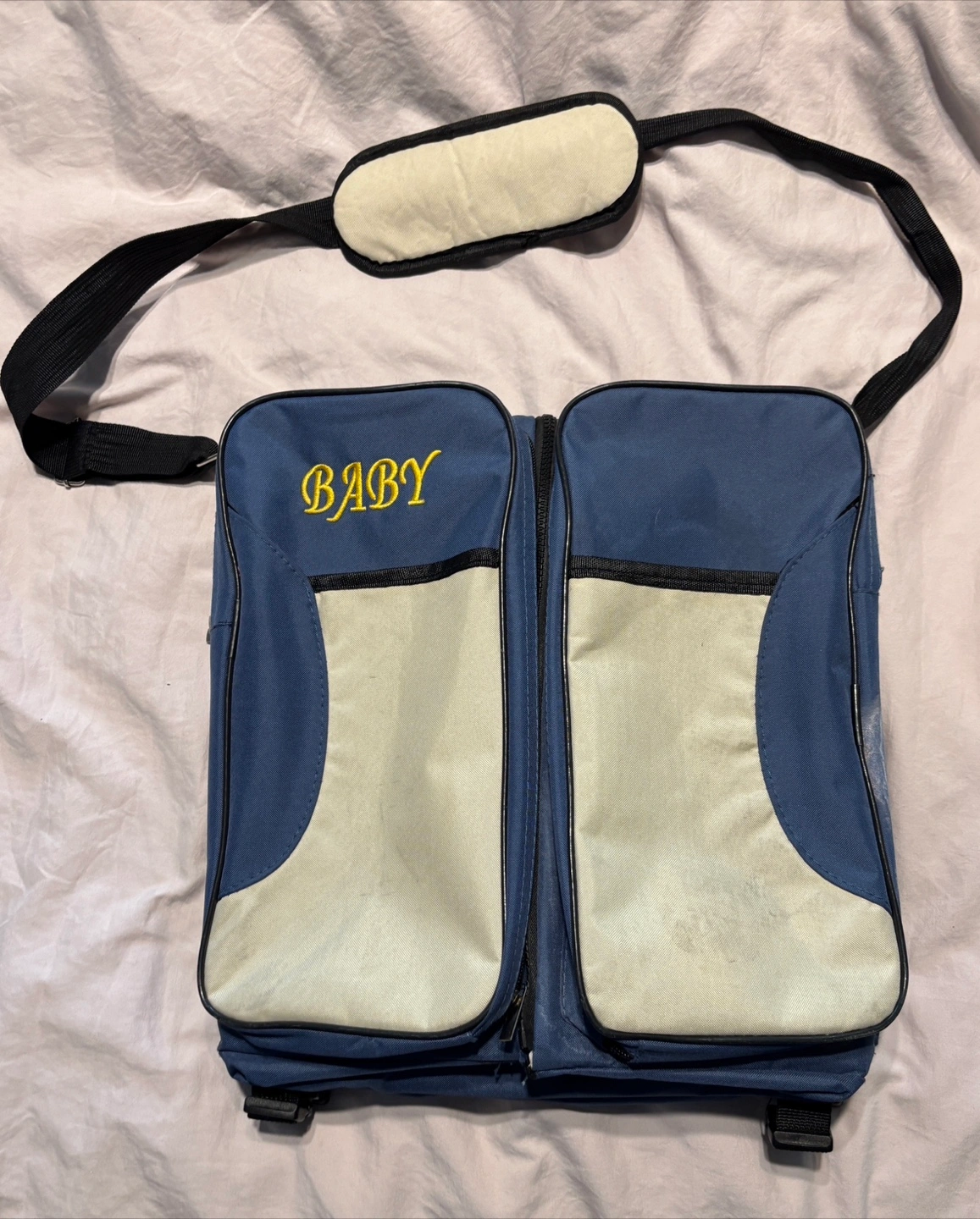 97Blue and beige portable baby bassinet. Folds flat for easy storage and transport. Multiple pockets for storage. Shoulder strap included. Ideal for travel, camping, etc