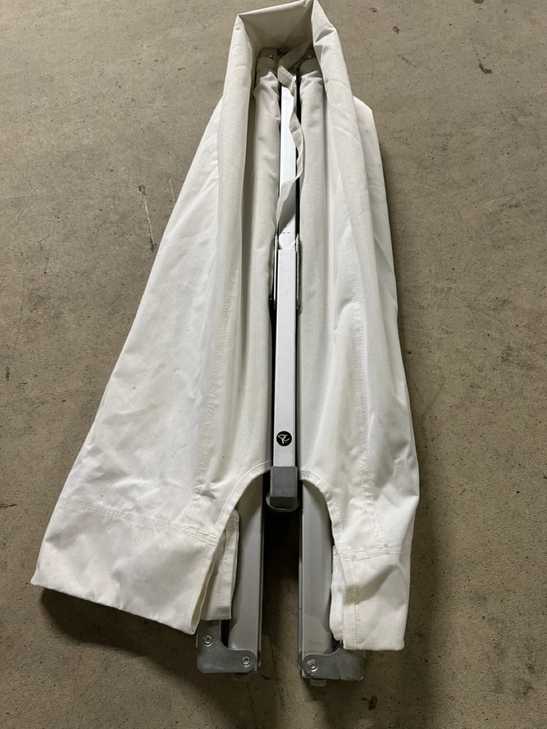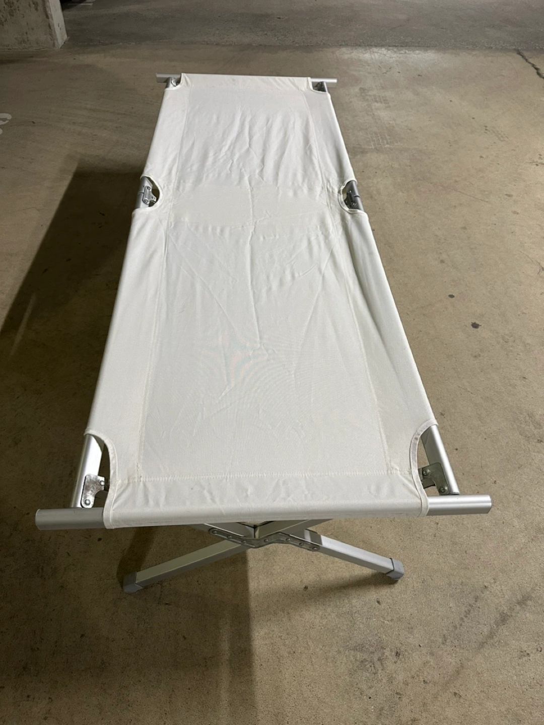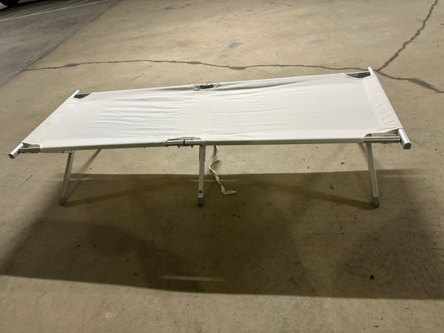 223Lightweight aluminium frame cot. Off-white canvas fabric. Folds for easy storage and transport. Includes a carry bag. Good for camping or traveling.