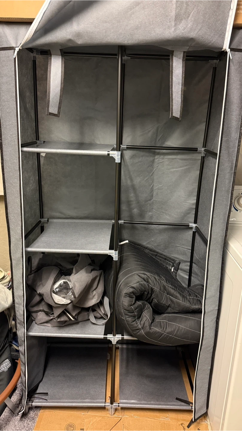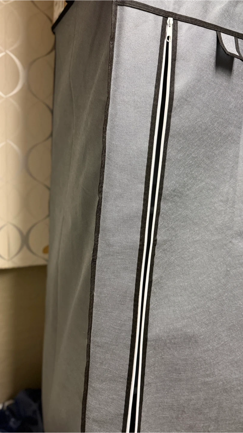 64Selling a portable closet wardrobe in grey. Product details Top highlights Colour Dove Gray Brand SONGMICS Size 2 Tiers (34.6"L) Item weight 3.4 Kilograms Style Clothes Closet Assembly required Yes 【ONE STORAGE STATION FOR ALL】With 2 hanging rods for your daily outfits, 5 storage shelves for underwear, socks, and 3 bottom storage spaces for shoes, or storage boxes, this non-woven fabric wardrobe provides ample space for everything 【VERSATILE PLACEMENT OPTIONS】Measuring 17.7" x 34.6" x 66.1", this portable closet can be placed in your living room, cloakroom, or bedroom, ensuring any space remains neat and organized 【STRENGTH TO SUPPORT】With 0.6" dia. metal tubes, reinforced plastic connectors, and quality non-woven fabric, this portable closet organizer ensures sturdiness and durability, providing strong support for your beautiful clothes 【AWAY FROM DUST】Your favorite garments deserve to stay pristine and be better protected. The fabric cover, complete with a zipper and hook-and-loop fasteners, ensures your clothes are stored properly. No more dust worries!
