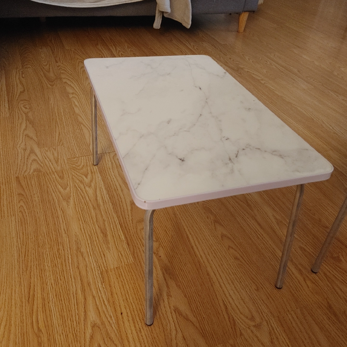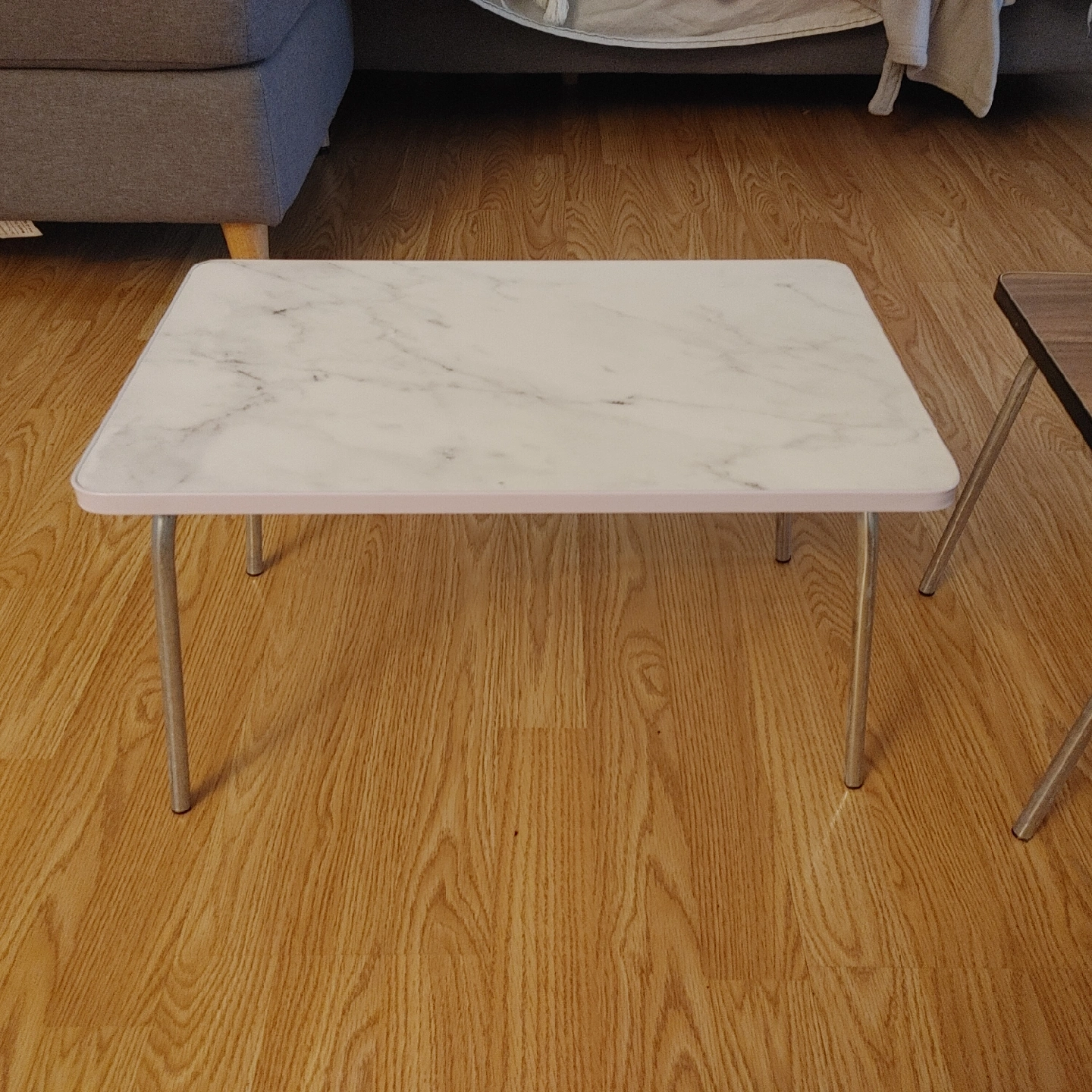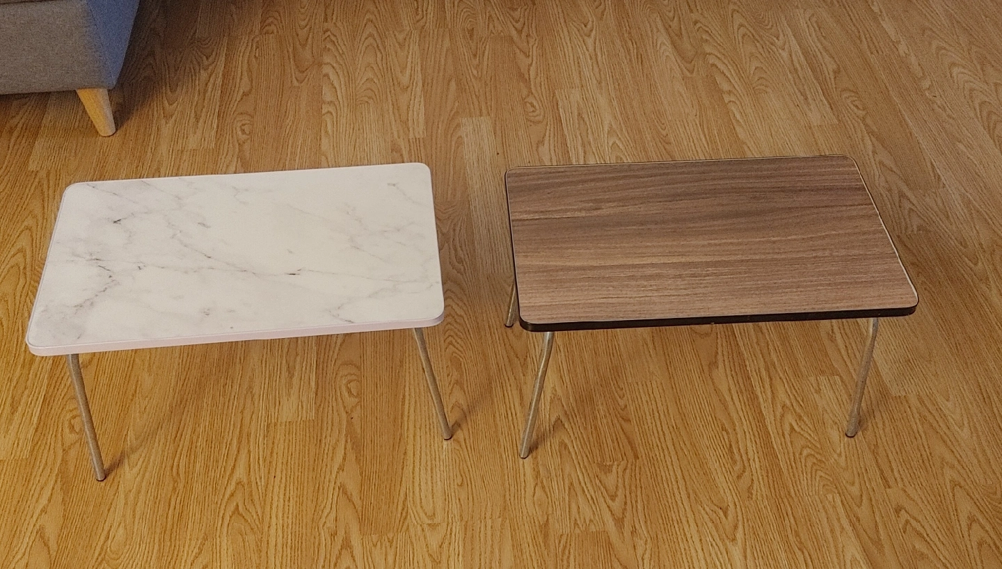 Selling a folding tables perfect for small spaces or as a temporary work surface. The legs fold easily for storage One has a marble-patterned top and the other has a wood-grain top. Both are brand new and would look great in any room each table dimensions 19" x 12" x (11"tall)