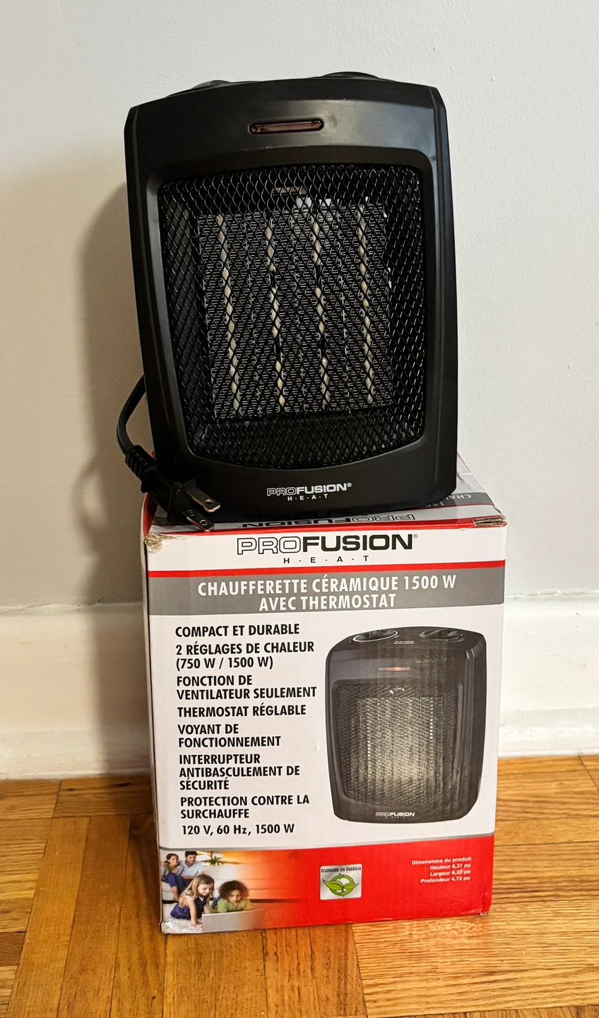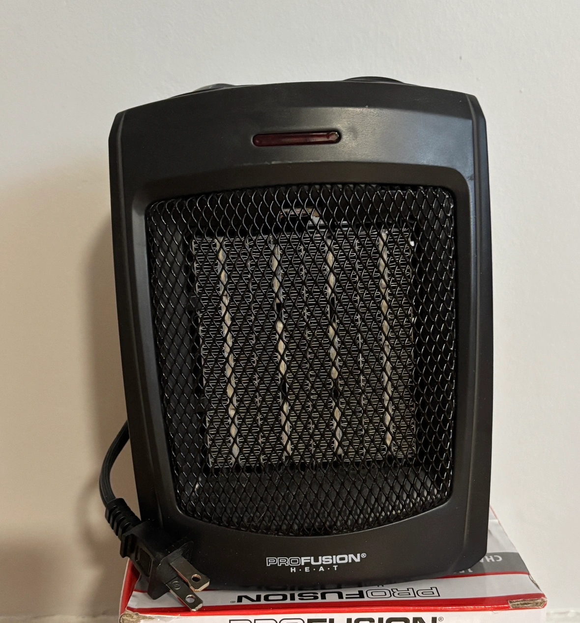 1500 watt ceramic heater with adjustable thermostat, safety tip over switch, and two heat settings.