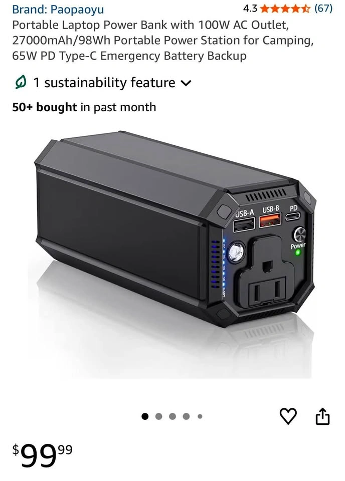 Buy & SellPortable Laptop Power BankPortable Laptop Power Bank$70Portable Laptop Power Bank with 100W AC Outlet, 27000mAh/98Wh Portable Power Station for Camping, 65W PD Type-C Emergency Battery BackupWHERE TO MEETCheck LocationView MapSELLERverifiedJLCarluke Crescent844 reviews1 chats·1 favorites·30 views