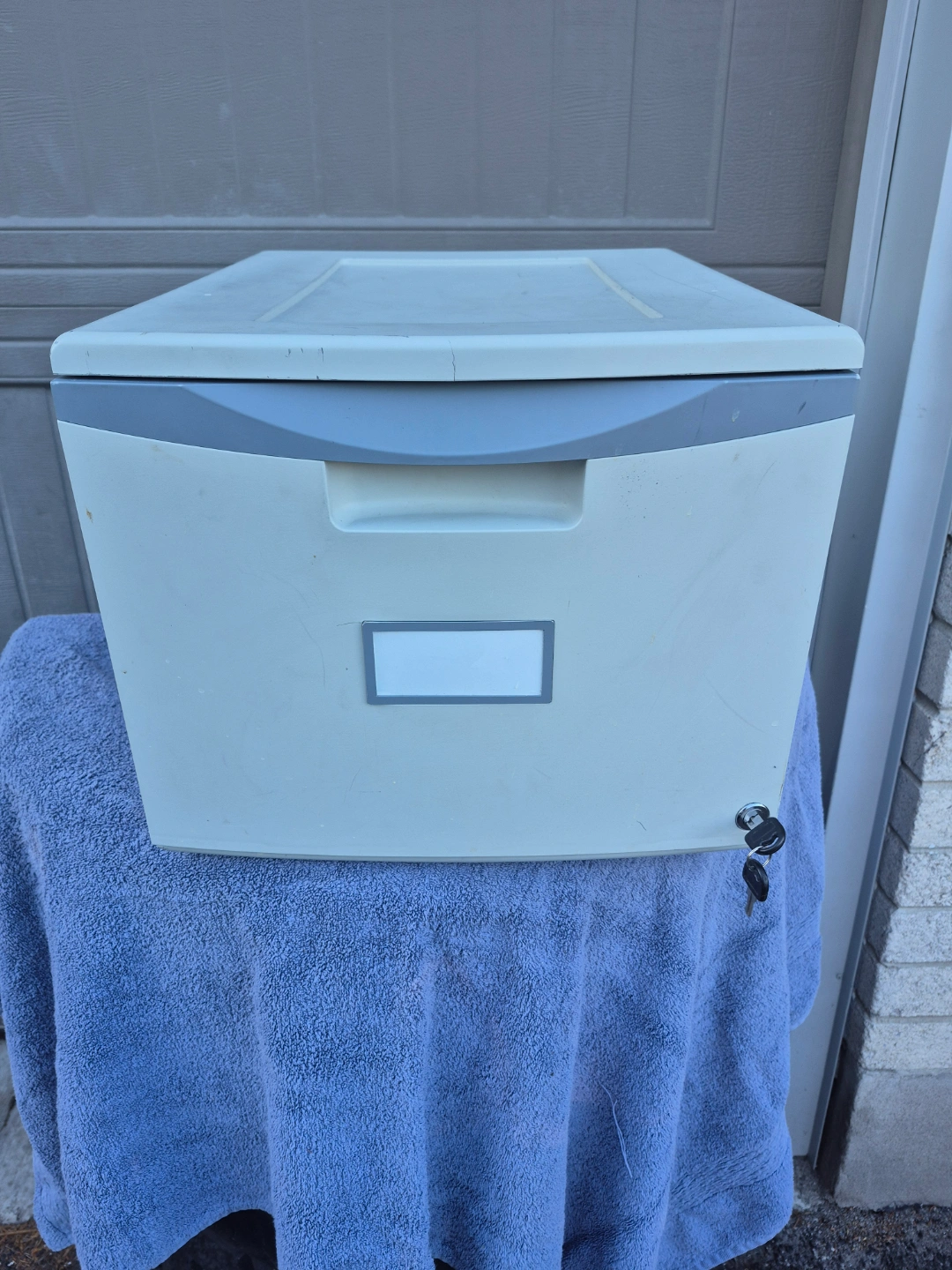 Single drawer filing cabinet. Off-white plastic exterior. Grey handle and accents. Includes key. Some minor surface scratches.