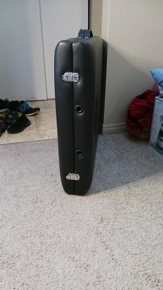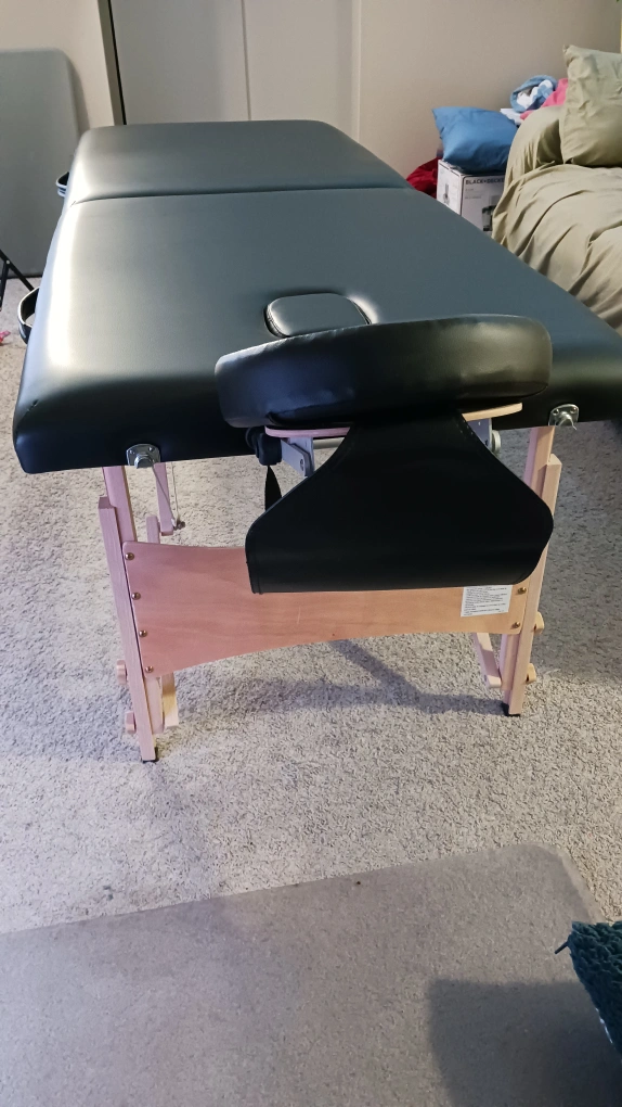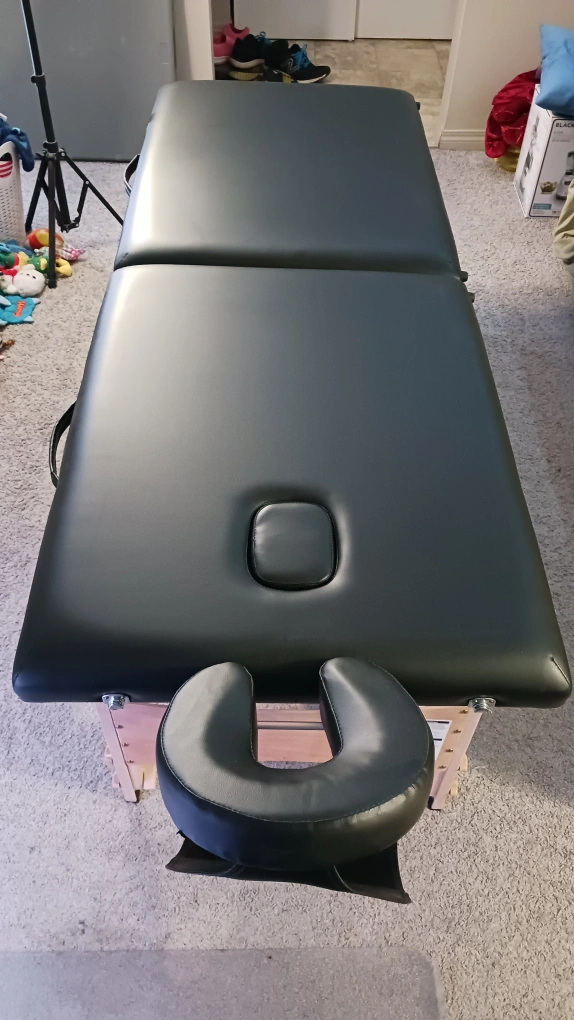 50Black massage table, two sections, wooden frame, includes face cradle. Portable design, folds for storage. Good condition.