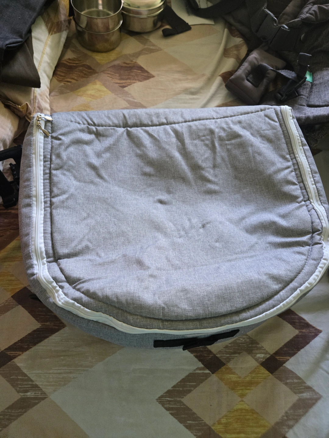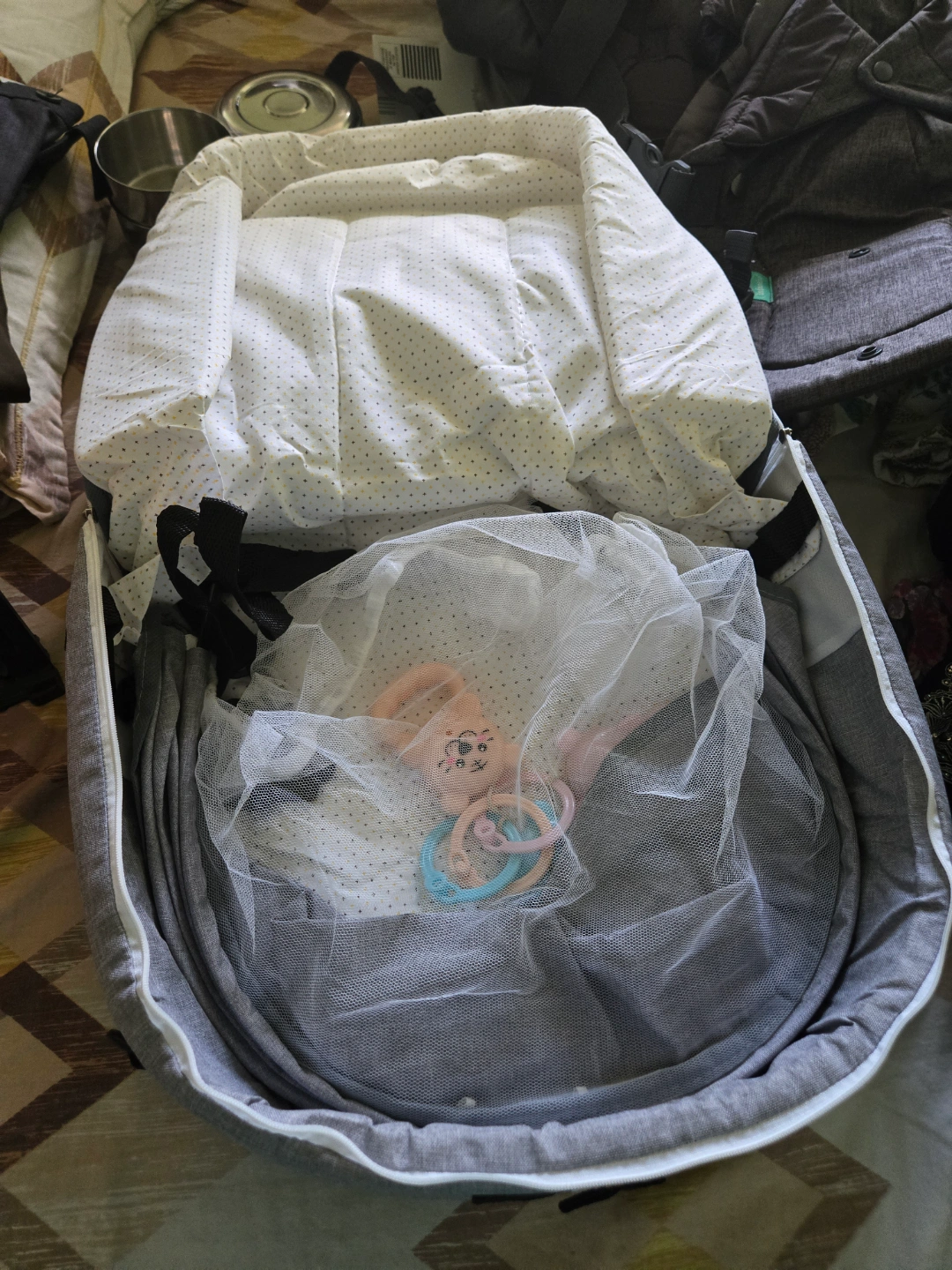 42Grey fabric bassinet, folds flat for easy storage and travel. Includes a built-in mosquito net and a padded mattress. Lightweight and portable, perfect for travel or home use. Some minor wear and tear.