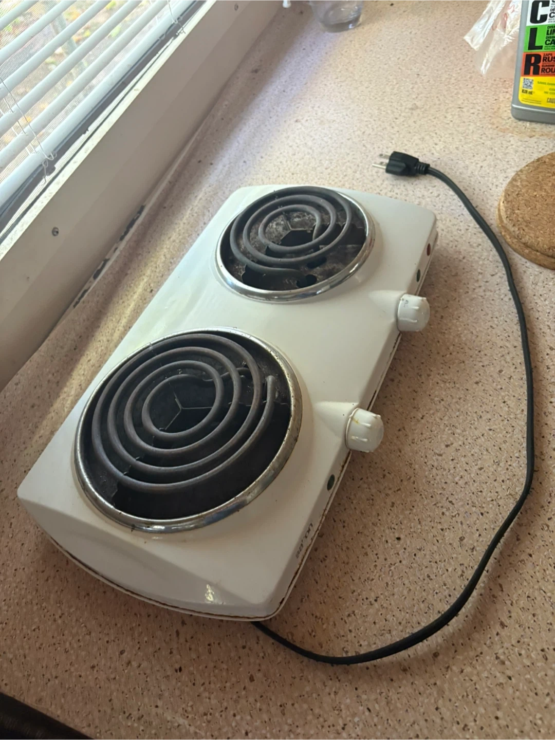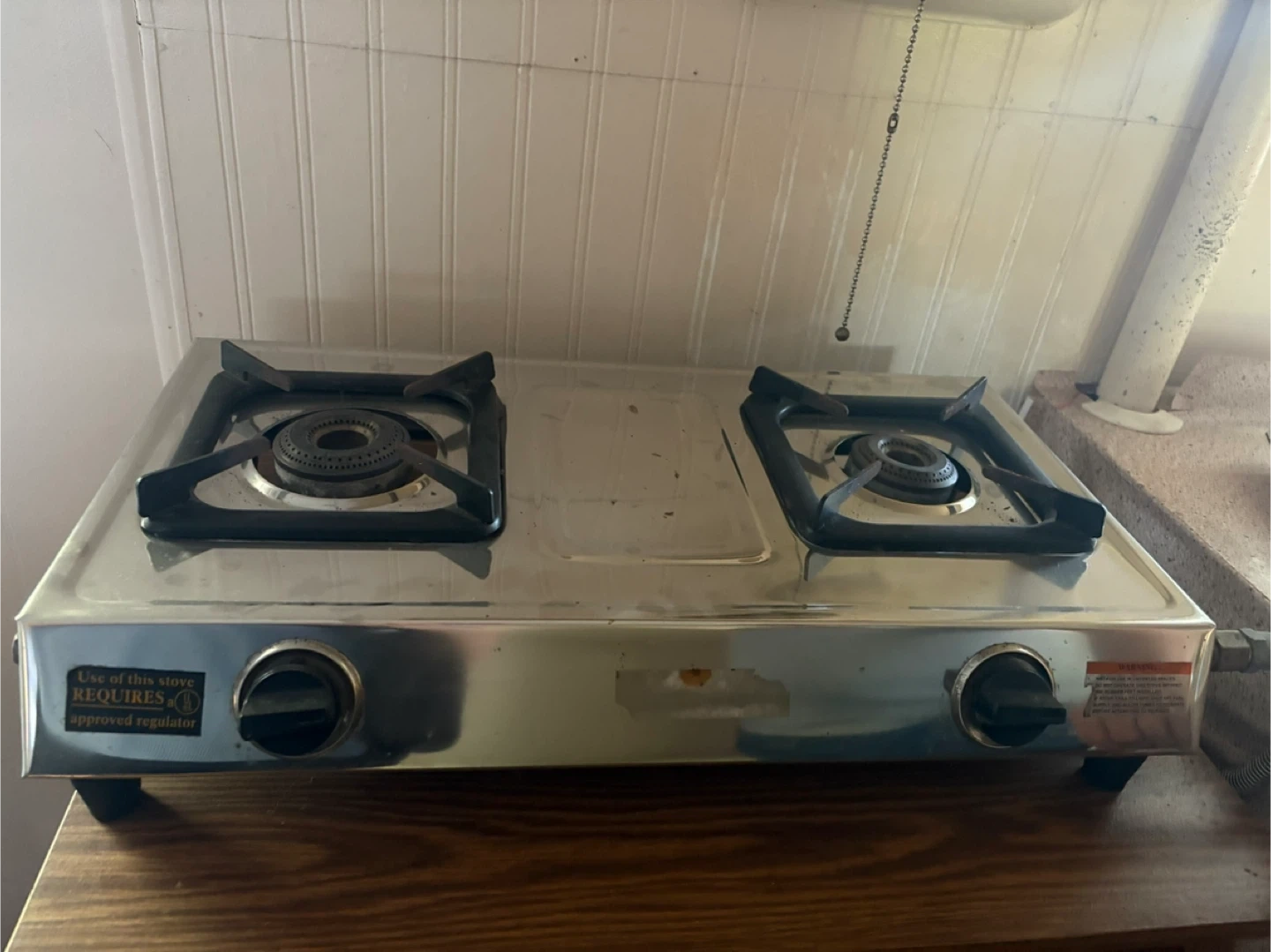 Selling a portable two-burner stove. It's perfect for camping or as an extra cooking surface in your kitchen. It's in good working condition and ready to use! One gas one not.