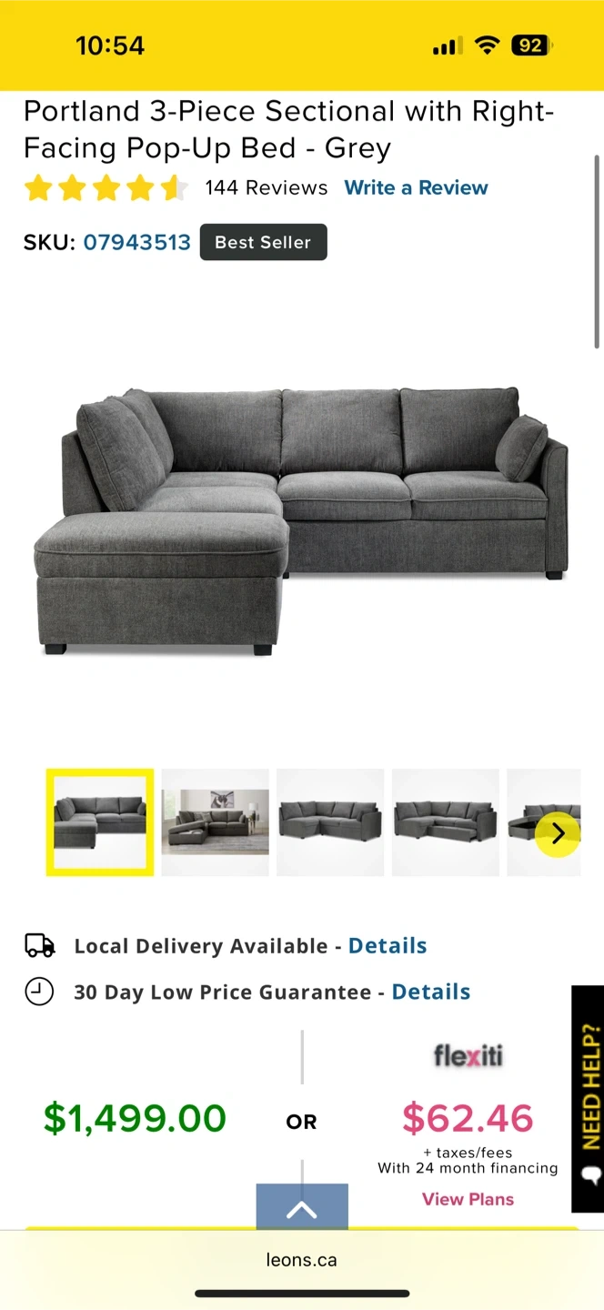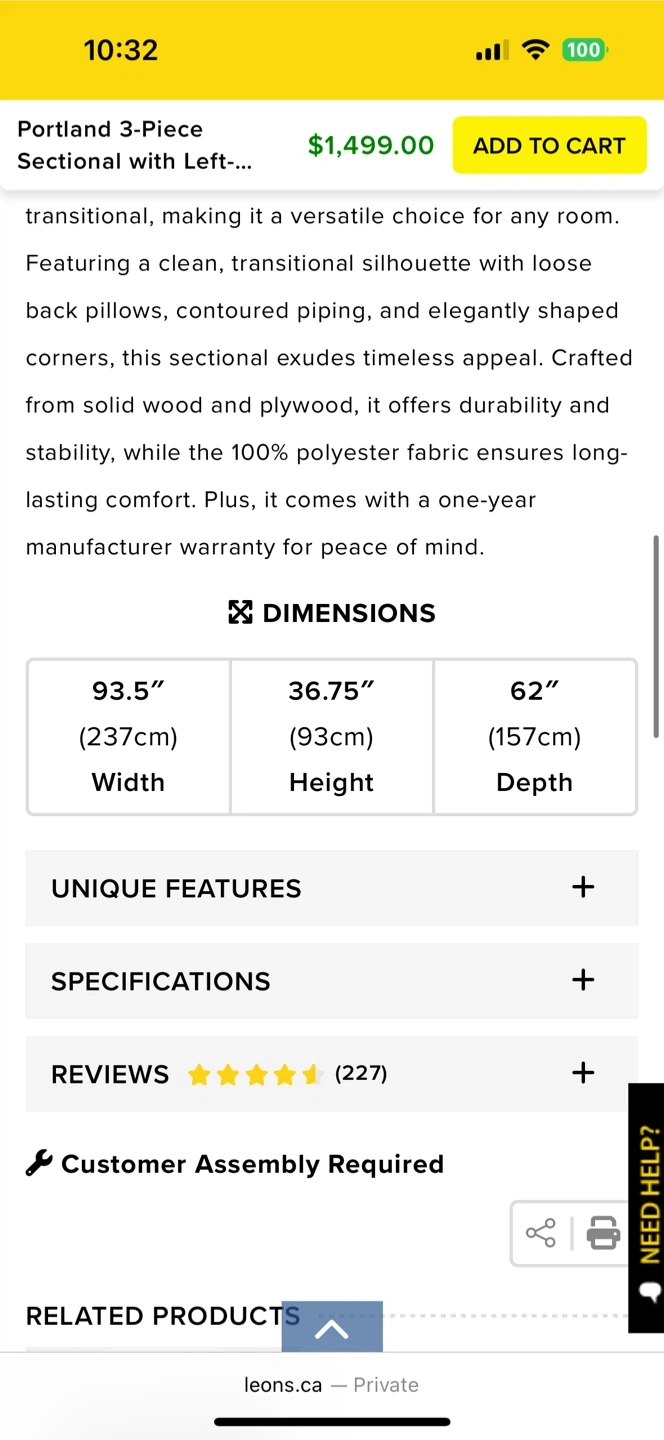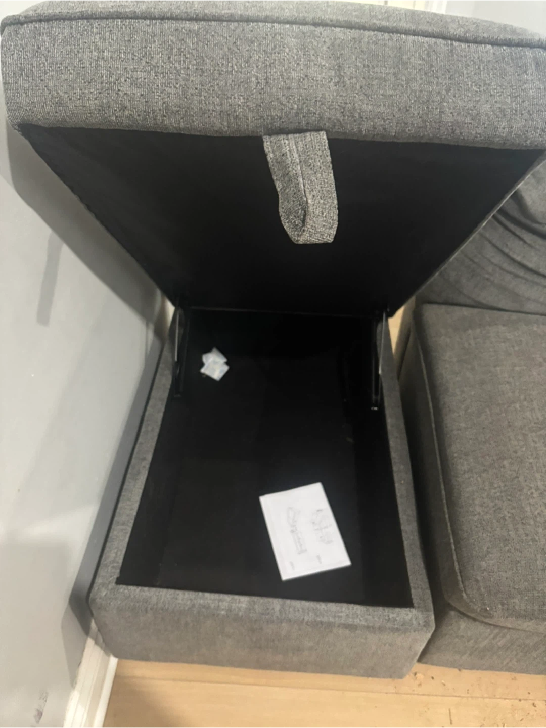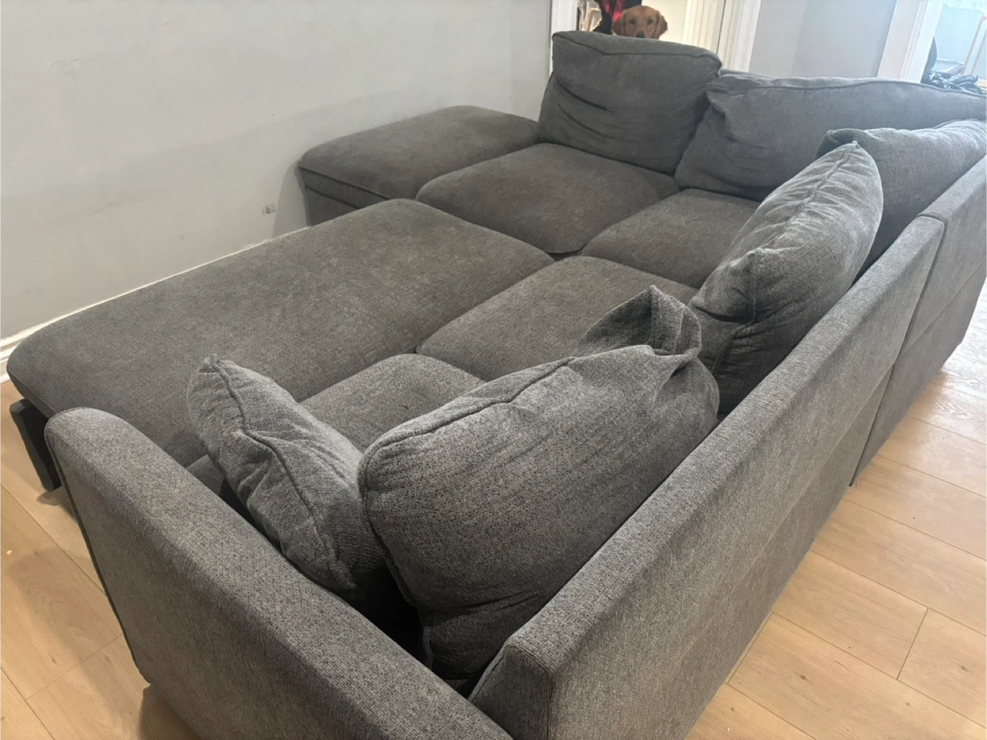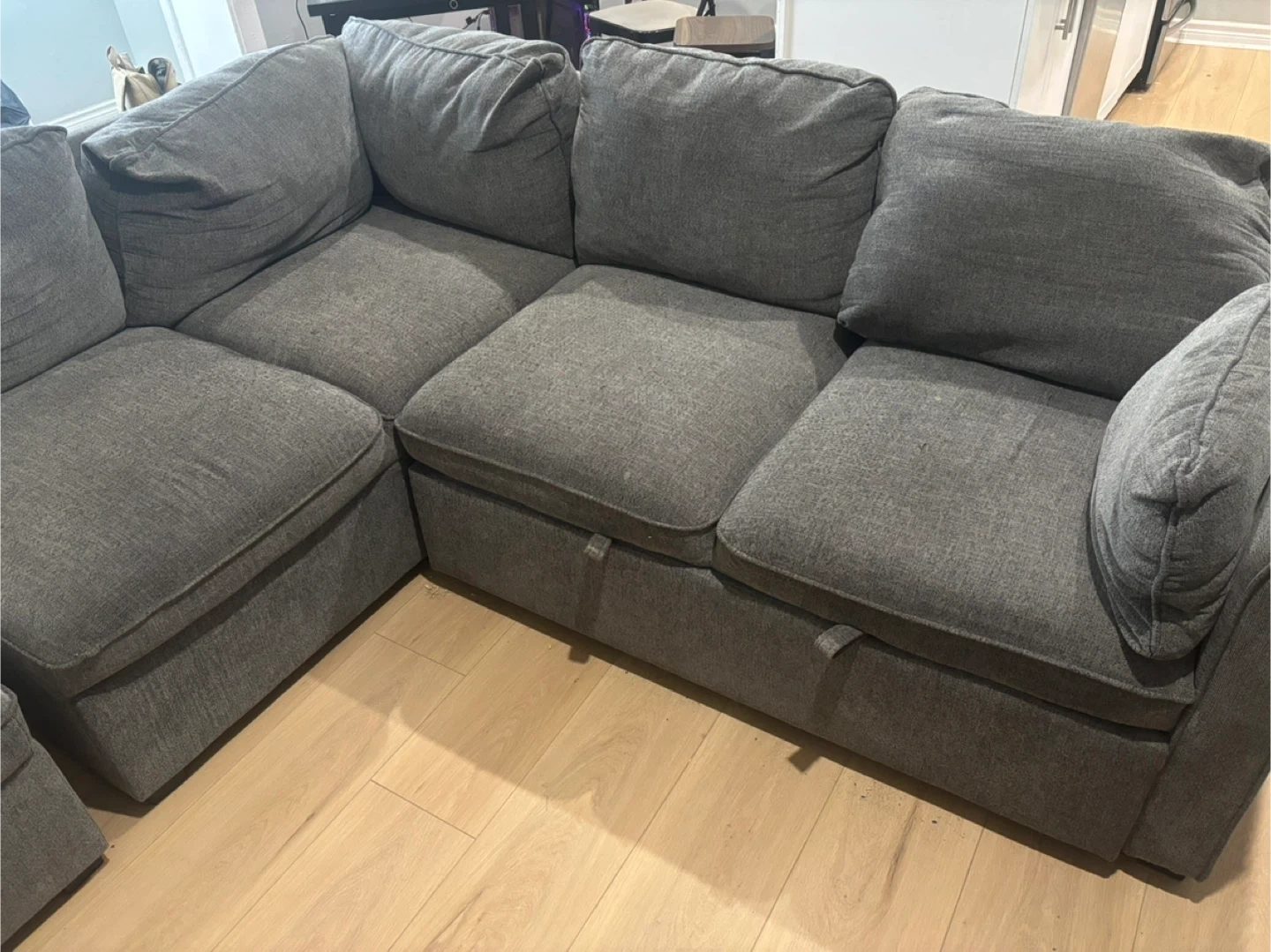 15Selling a Portland 3-Piece Sectional Sofa in grey. It has a clean, transitional silhouette with loose back pillows, contoured piping, and elegantly shaped corners. The sofa is made from solid wood and plywood, ensuring durability and stability, while the 100% polyester fabric ensures long-lasting comfort. Dimensions are 93.5" (width) x 36.75" (height) x 62" (depth). Originally bought for $1,499.00. Pull out couch with Ottoman
