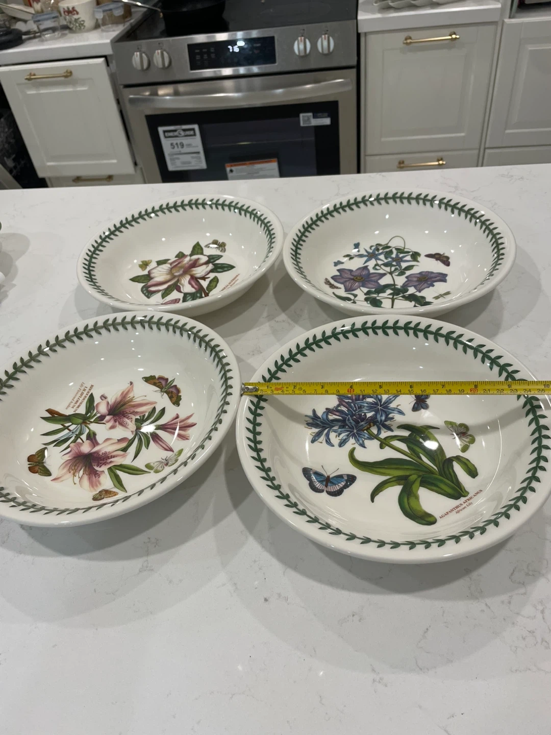 Here's a set of four Portmeirion Botanic Garden bowls! They feature different floral designs and a green laurel border. They measure approximately 8.5 inches in diameter. Perfect for adding a touch of nature to your table!