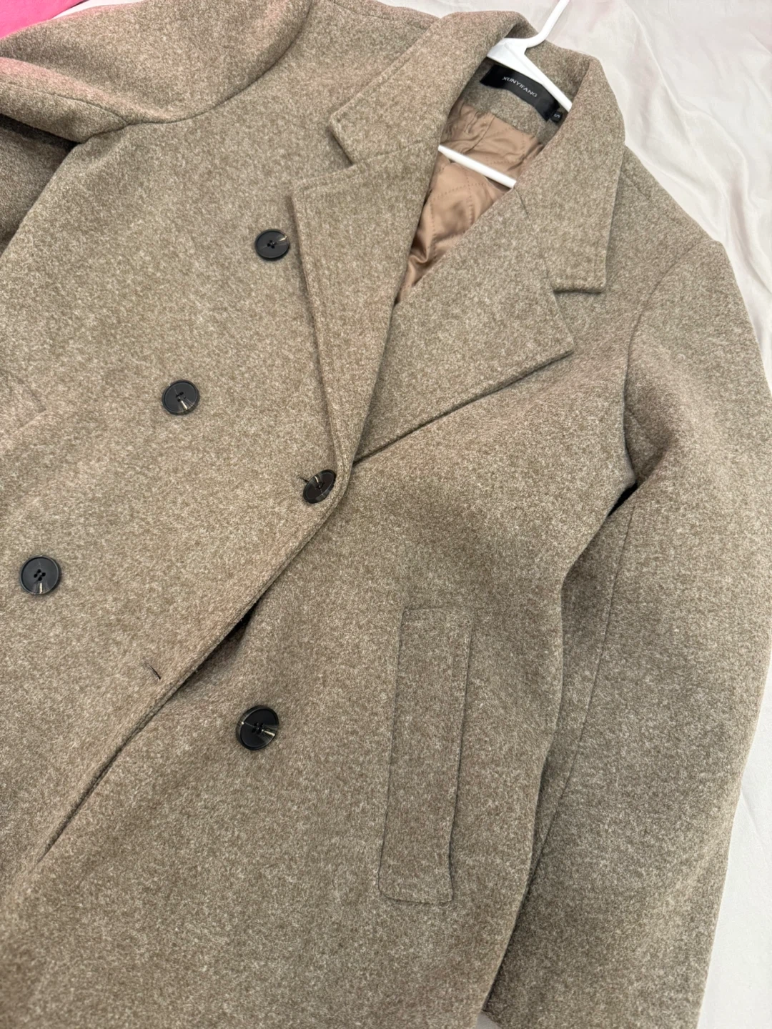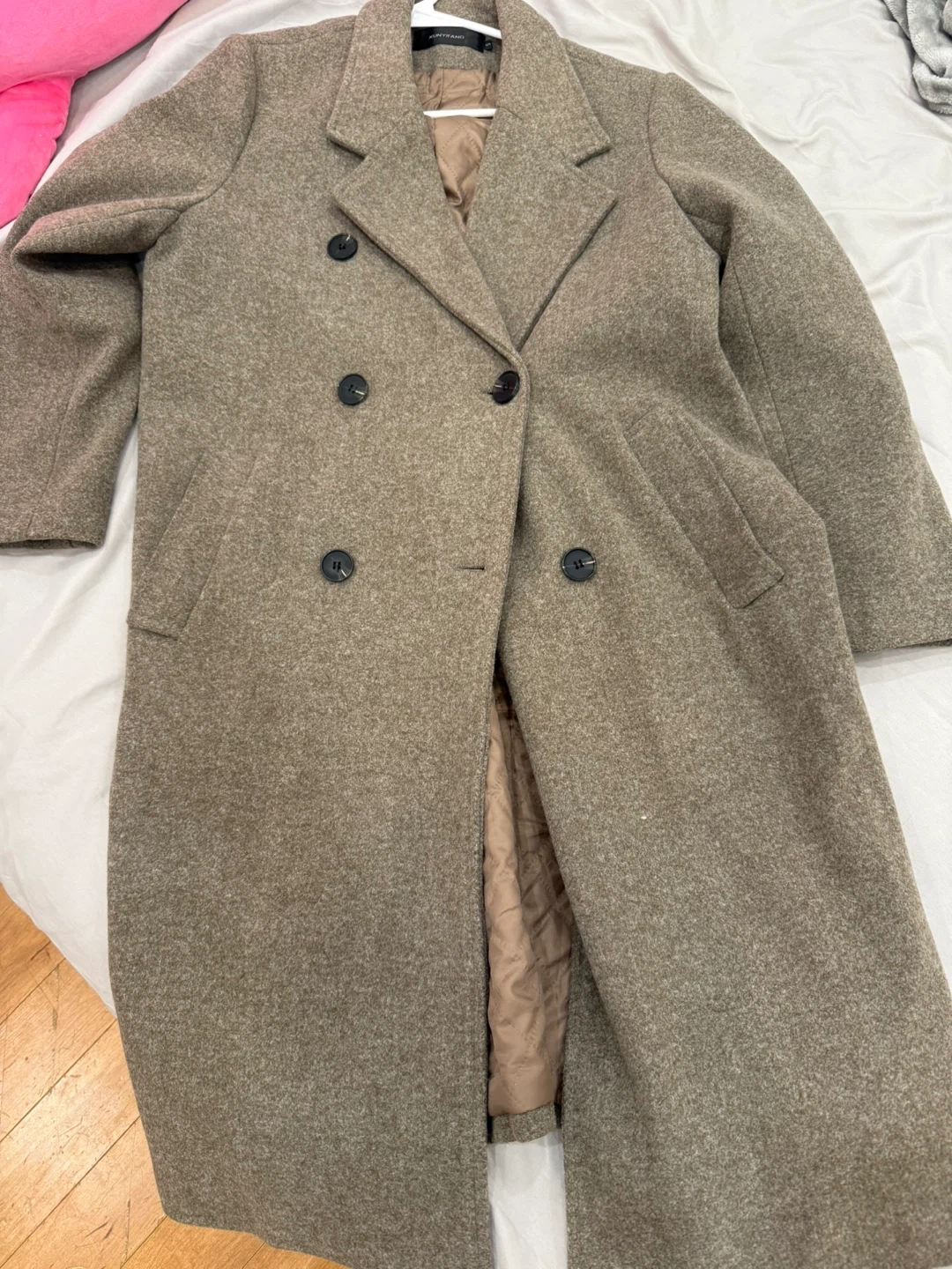 Here's a Portrait Report coat in a lovely neutral colour. It's a wool blend, perfect for keeping you warm on chilly days. This coat is in great condition and ready for a new home