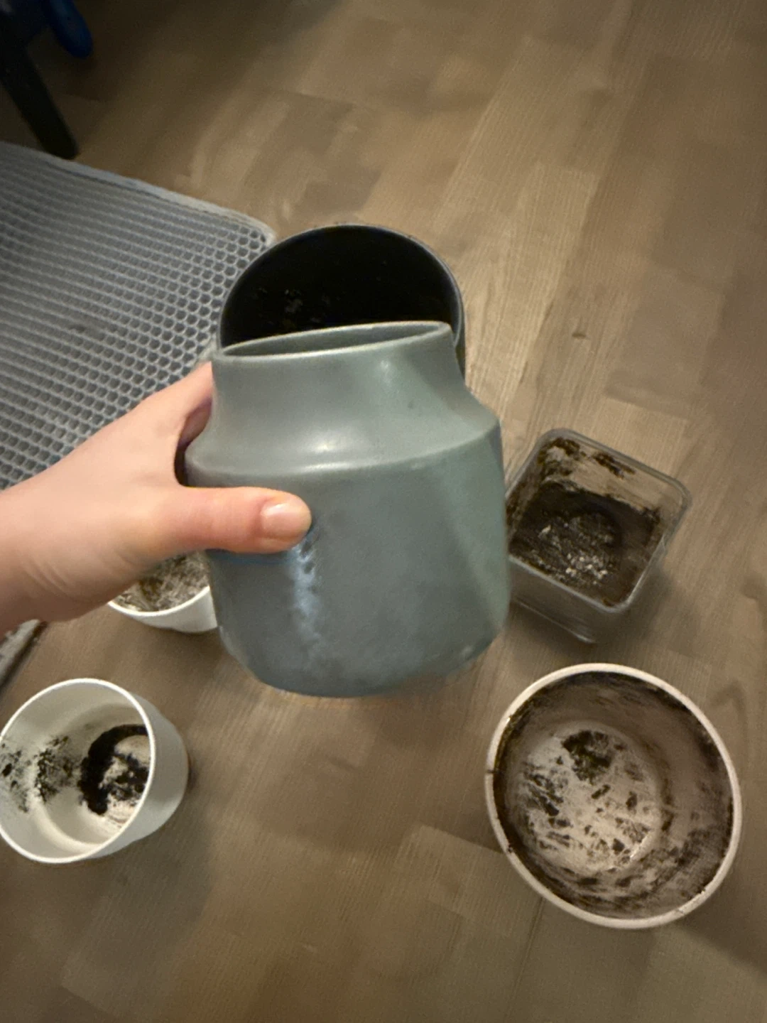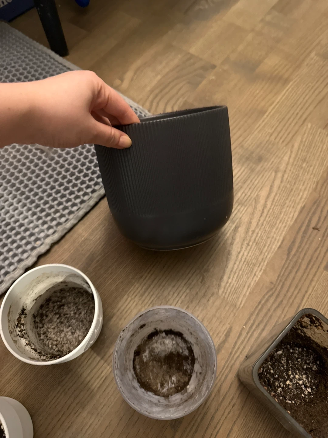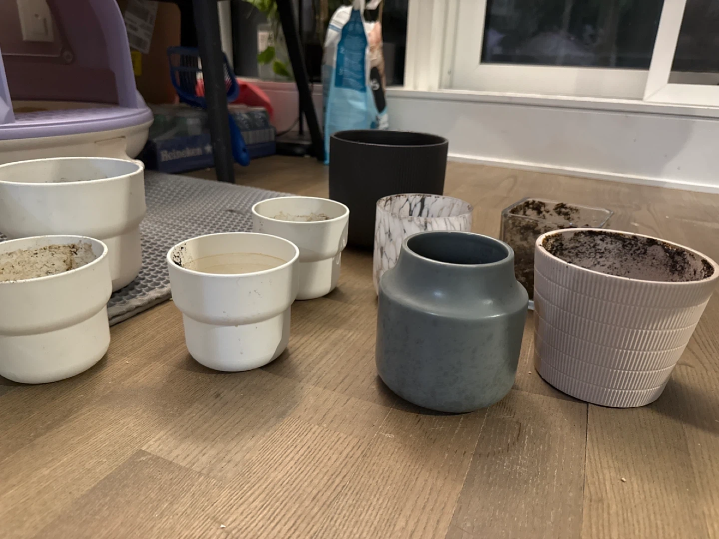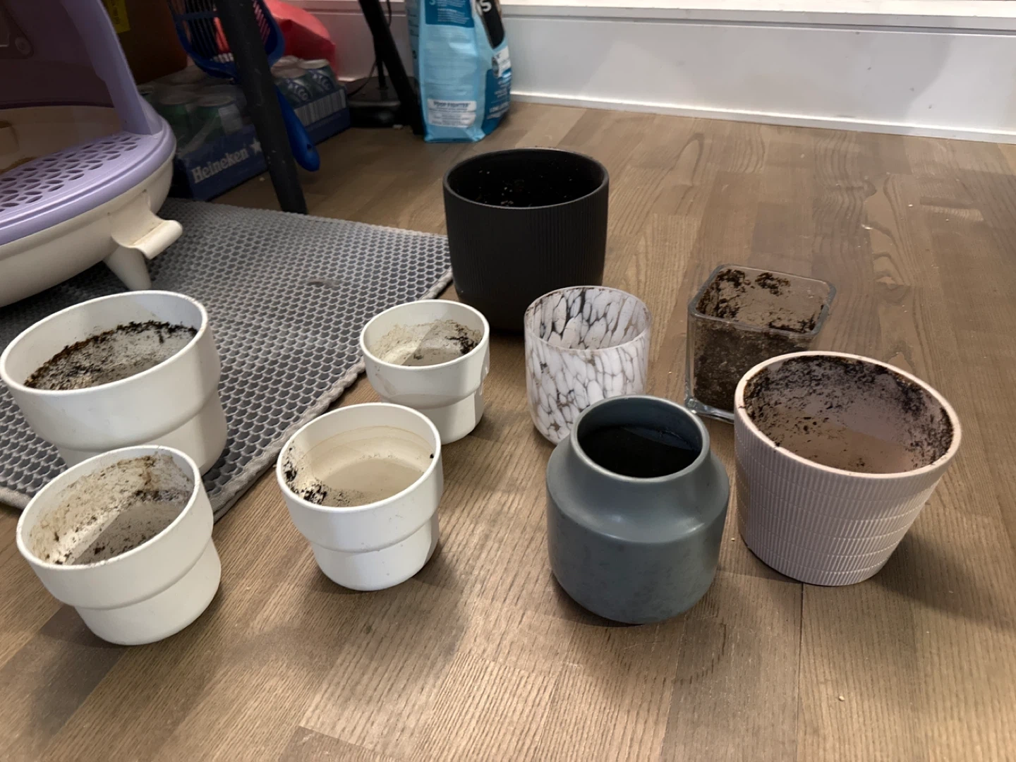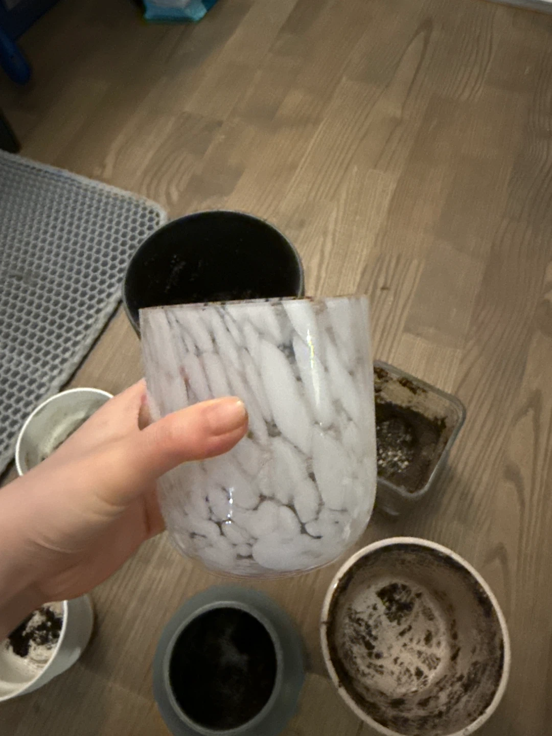 A collection of various plant pots including ceramic, plastic, and glass styles. Sizes vary to accommodate different plants. Includes one marbled glass pot, a ribbed grey pot, a matte grey vase-style pot, several white plastic pots, and a clear square pot.