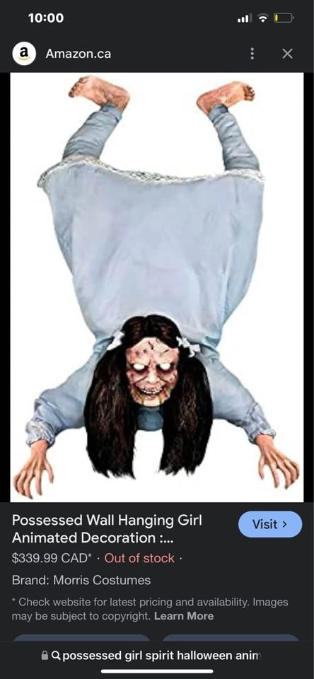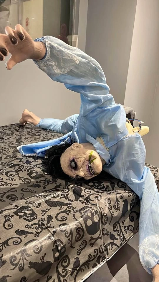 Hang on the ceiling, on a door or on a wall and watch your guests get completely spooked! Bought used and used it for 1 night for our Halloween party. And she is really nasty! We hung her in our guest bathroom shower wall. She says 4 different things. Eyes light up and head turns. You can pose her legs and arms. She is a good 5 feet or more tall if you stretch her out fully. 4 feet in the position she is in on our shower wall. Great quality item. Pick up in Mississauga near Erin Mills and 403.