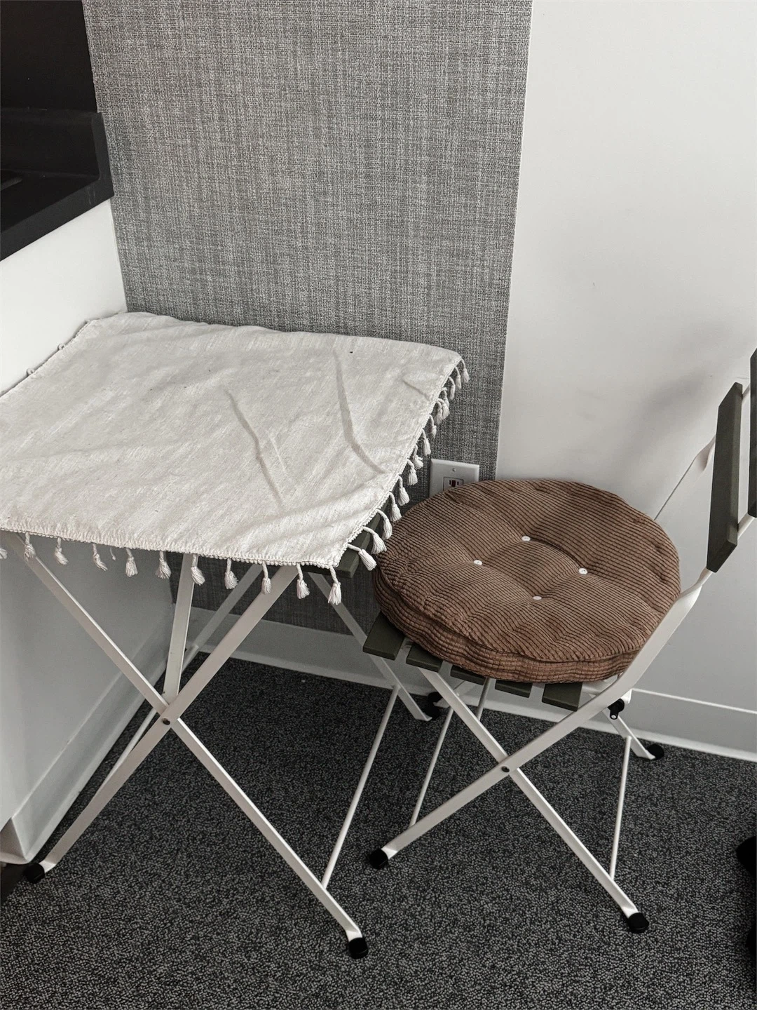 Compact folding bistro table with a white fringed cloth and a matching folding chair with a brown corduroy cushion. Metal frame construction.